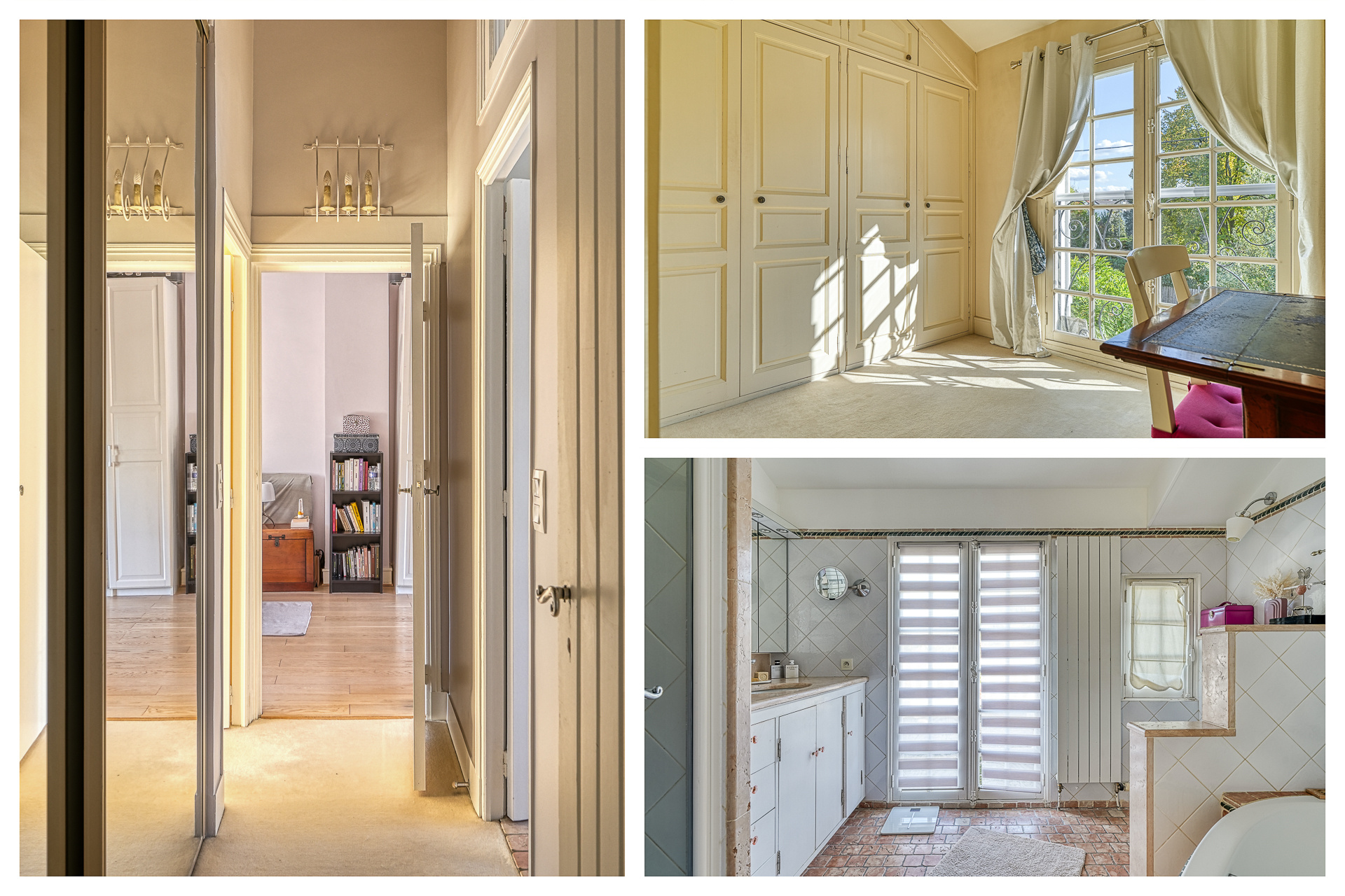 Au 1er étage : une suite parentale traversante avec une grande terrasse, un bureau ou une chambre bébé, une salle de bains avec douche et toilettes, un dressing, une chambre avec placard, une autre salle de bains avec douche et toilettes.