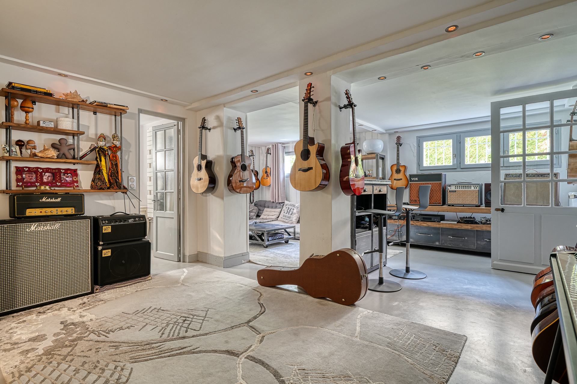 Au rez-de-jardin : une pièce spacieuse avec une entrée indépendante pour une salle de sport ou de musique..., une chambre avec placard, une salle de douche, des toilettes séparées, une grande buanderie aménagée avec de nombreux placards, une cave à vins, une chaufferie, un garage pour stockage et bricolage.