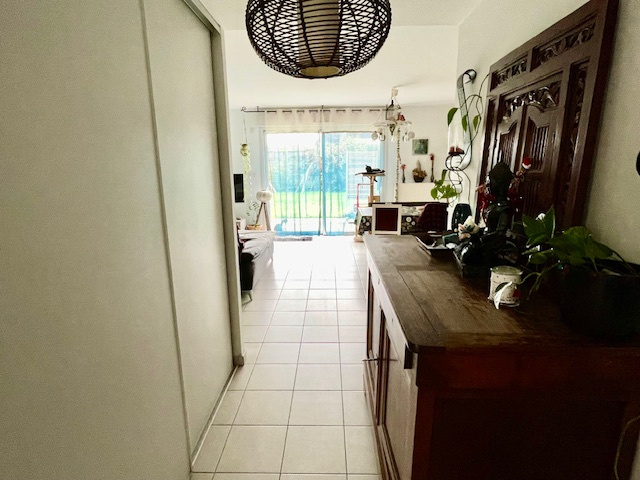 Rez de chaussée composé d'une entrée avec placard, pièce de vie lumineuse avec cuisine ouverte sur le séjour, espace parental avec chambre et salle d'eau, bureau