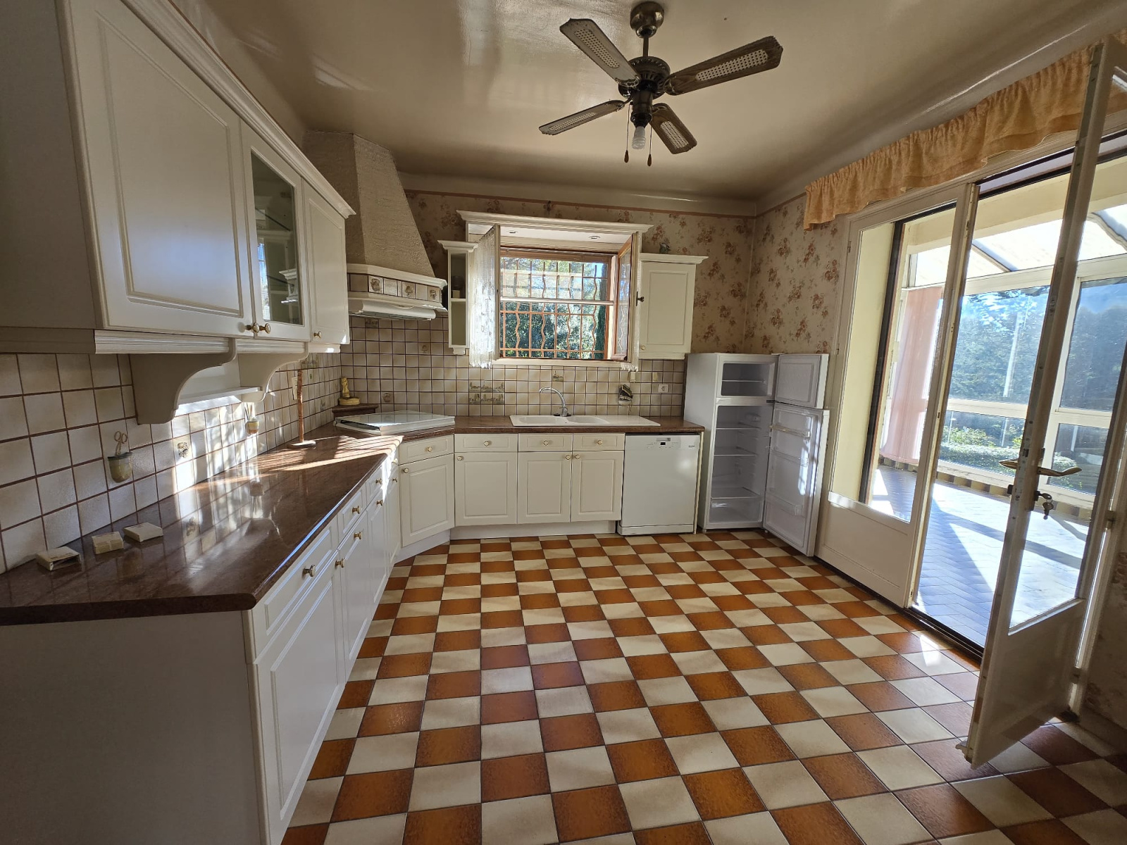 Une cuisine ouvrant sur une terrasse avec véranda