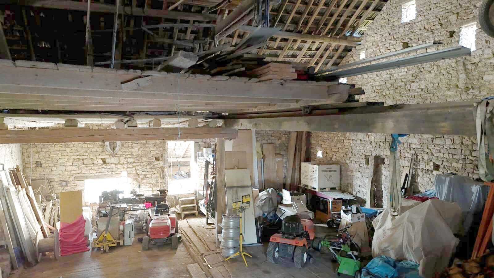 Superficie généreuse,la grange principale est dotée d'une large porte en bois de 3,30m de large sur 3,10 m de haut.