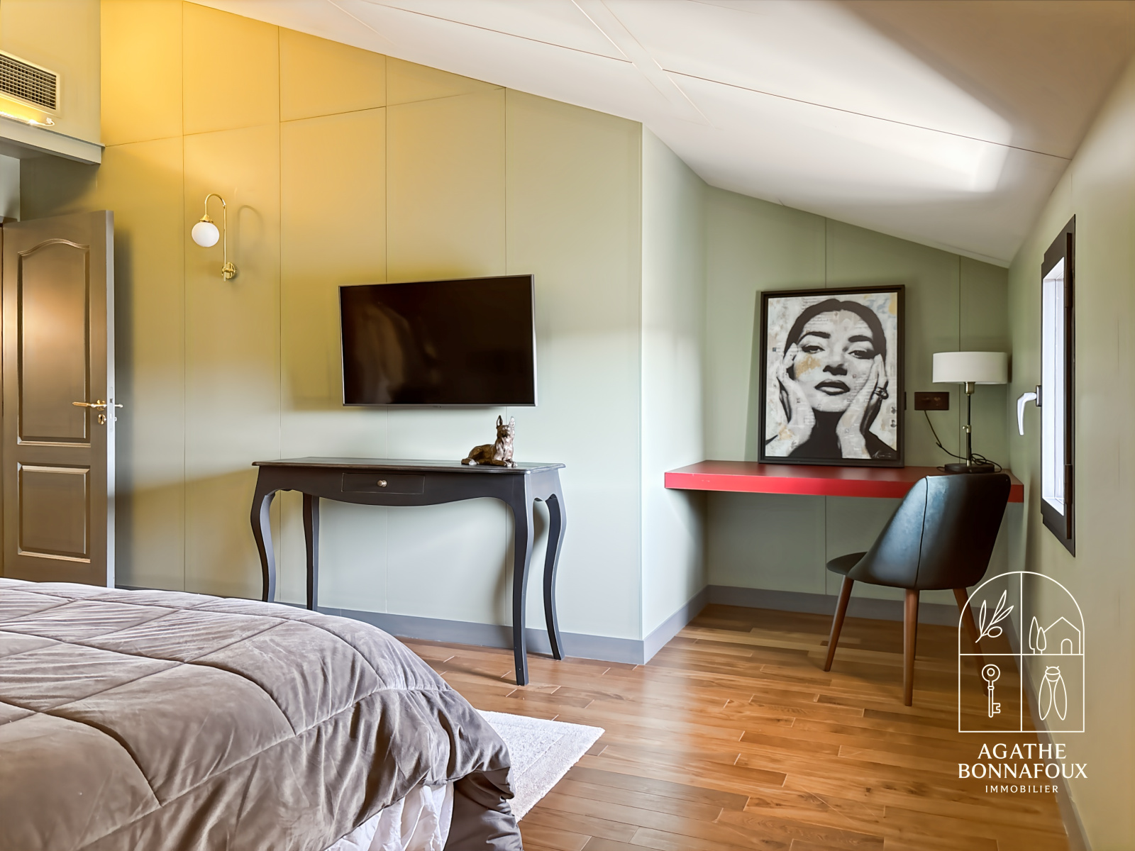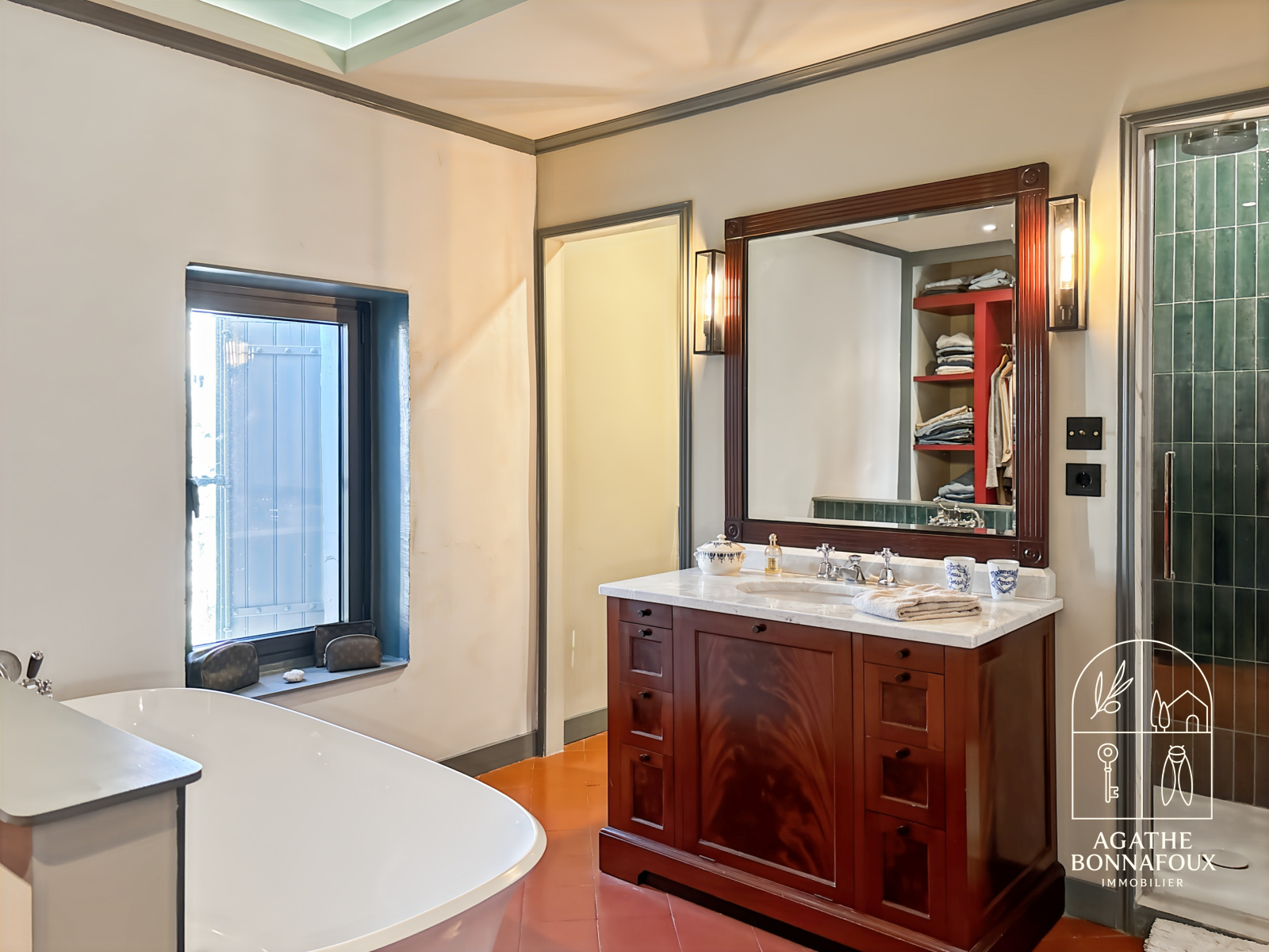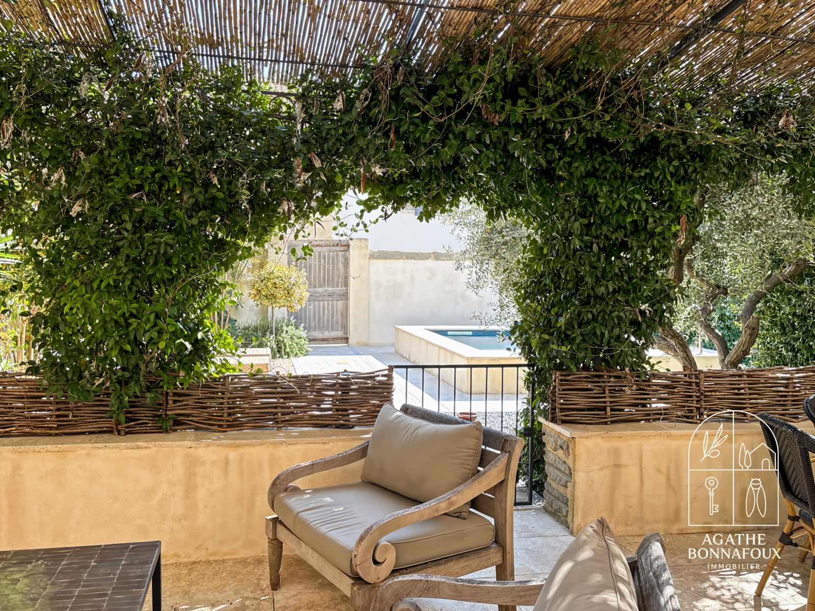 Dès l’entrée, le ton est donné : une cour intimiste, délicatement arborée, agrémentée d’un bassin, invite à la quiétude. Une vaste terrasse ombragée prolonge cet écrin de sérénité, offrant un cadre idéal pour recevoir en toute élégance.