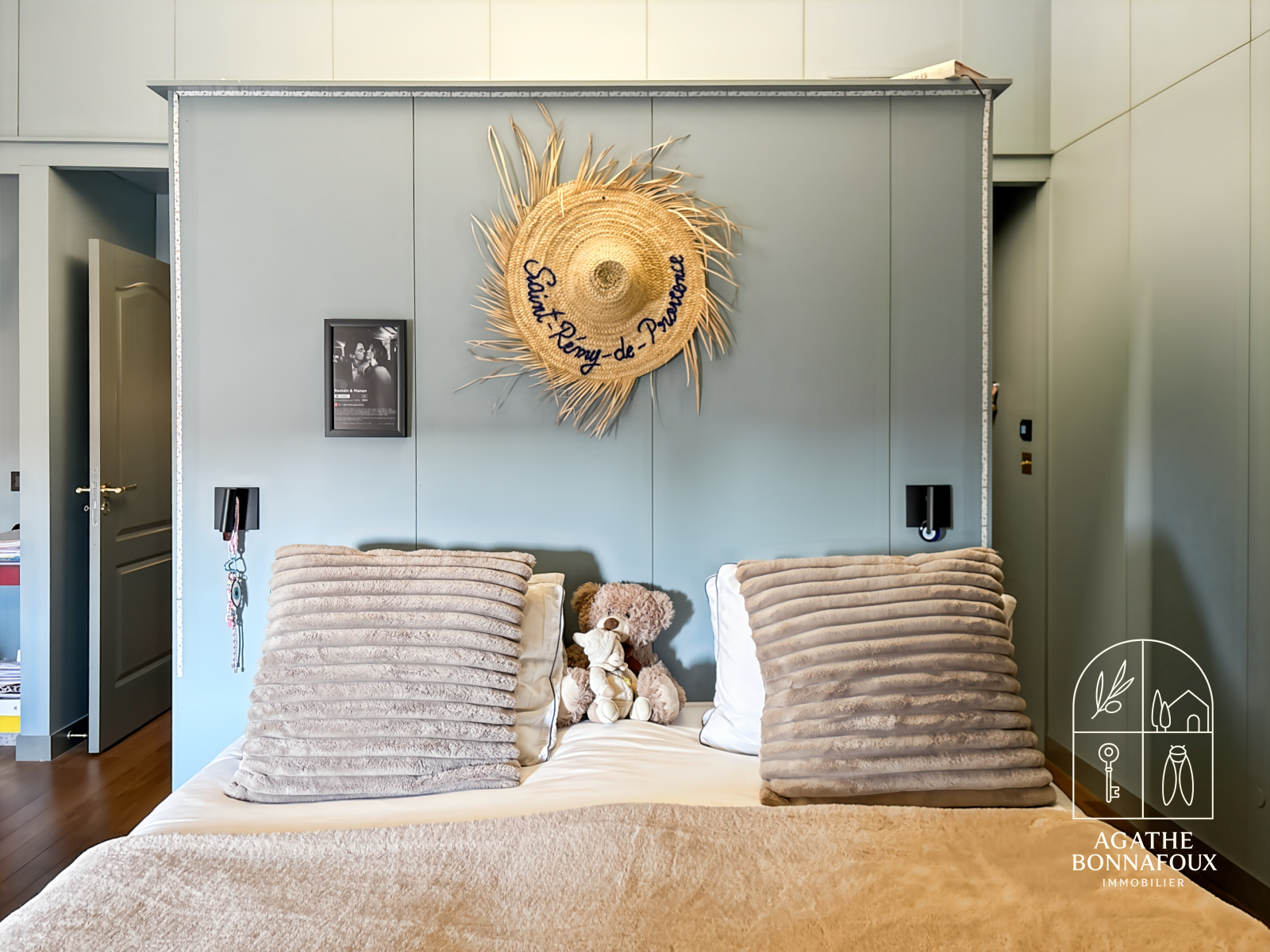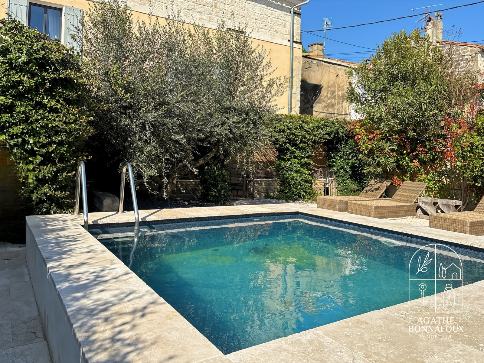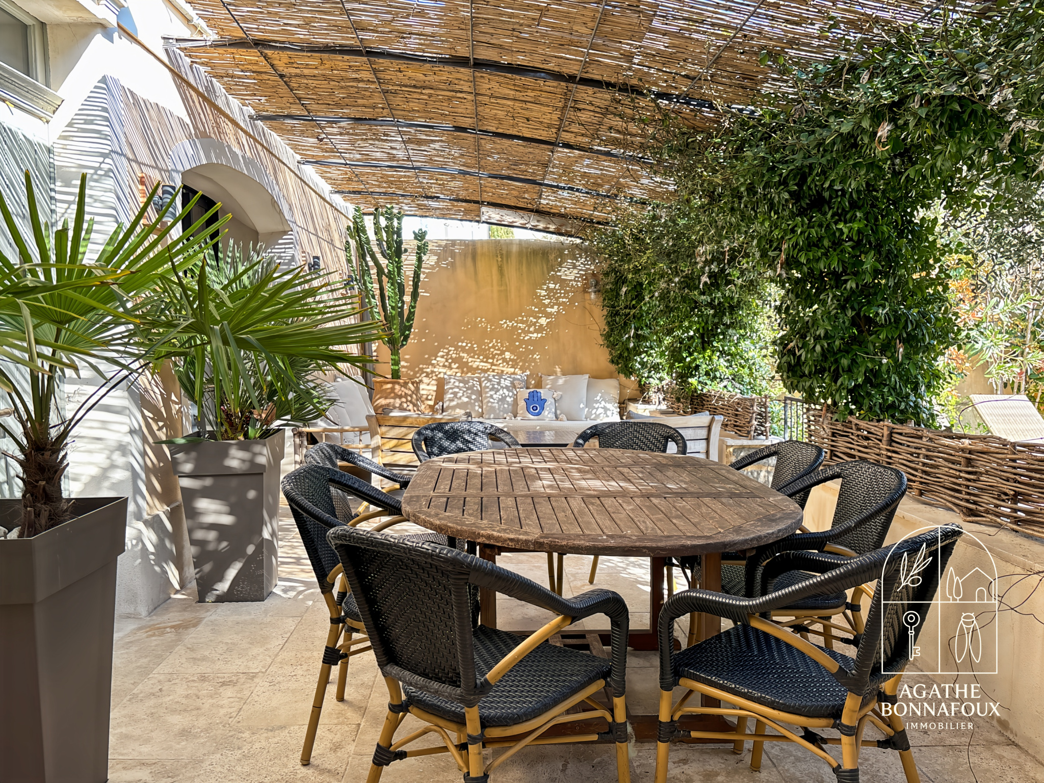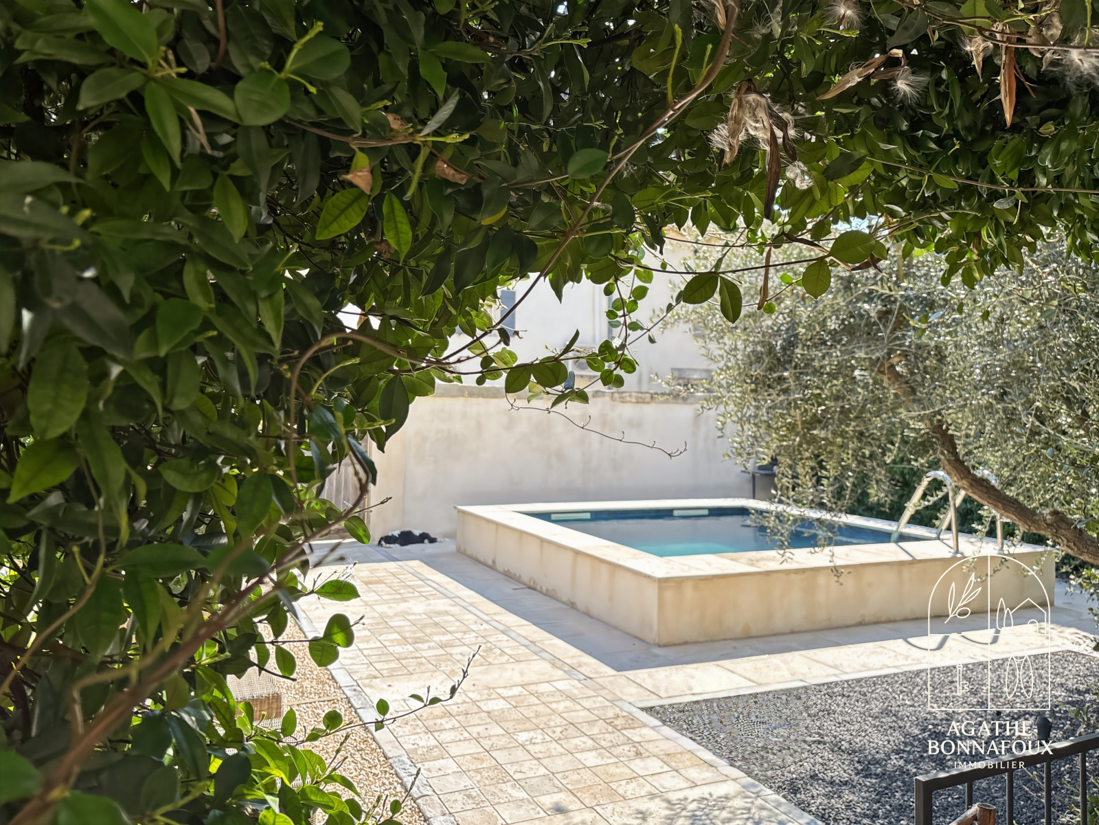 Dès l’entrée, le ton est donné : une cour intimiste, délicatement arborée, agrémentée d’un bassin, invite à la quiétude. Une vaste terrasse ombragée prolonge cet écrin de sérénité, offrant un cadre idéal pour recevoir en toute élégance.