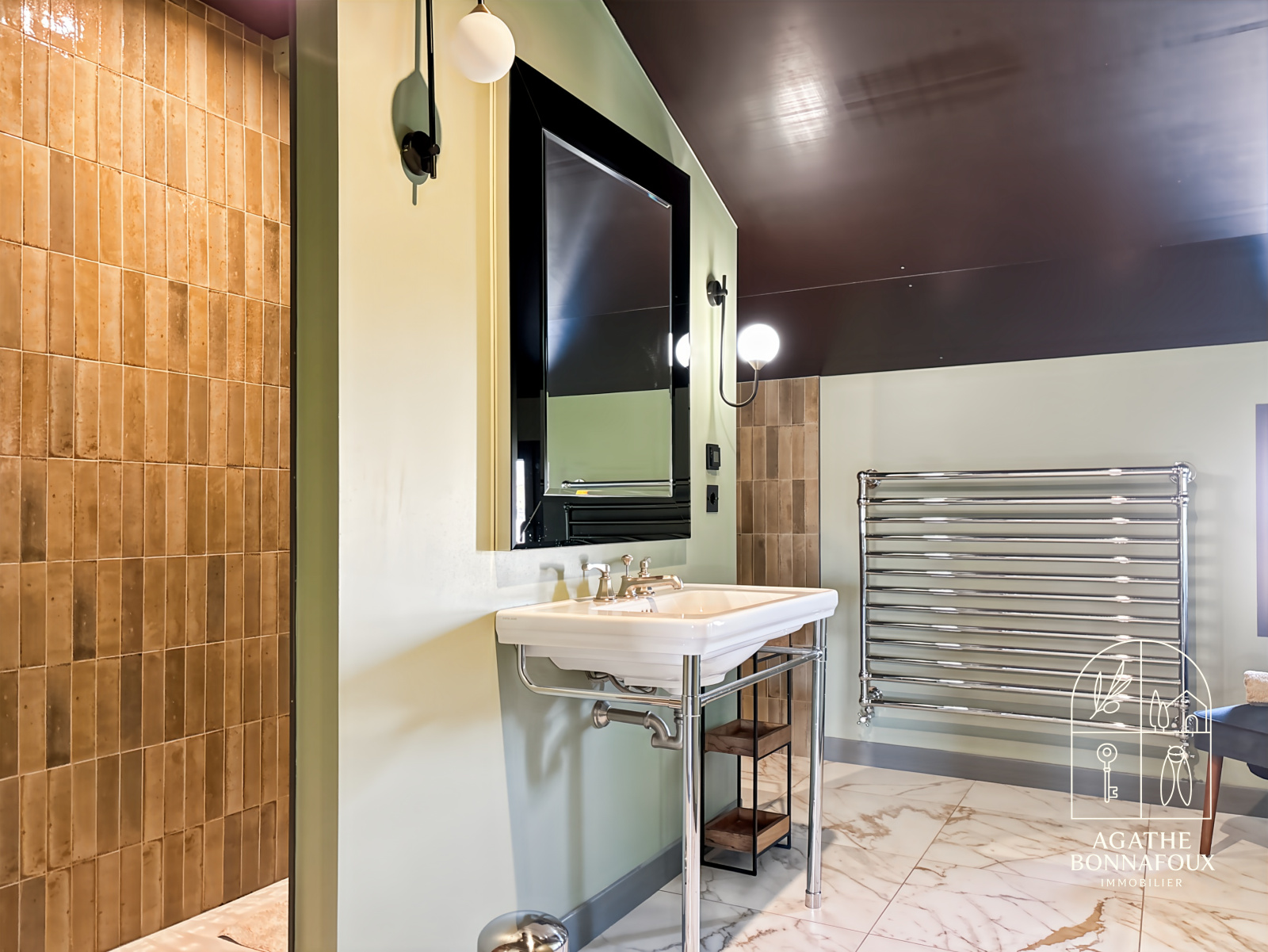 À l’intérieur, chaque détail a été pensé avec exigence. Les matériaux nobles — carreaux de ciment, cheminée en marbre — dialoguent harmonieusement avec des prestations haut de gamme (ascenseur). Le spectaculaire salon cathédrale, baigné de lumière et ouvert sur l’extérieur, confère une sensation d’espace et de grandeur. Une salle à manger raffinée et une cuisine de standing, entièrement équipée, viennent compléter ce niveau, accompagné d’un espace buanderie/cellier et de toilettes invités.