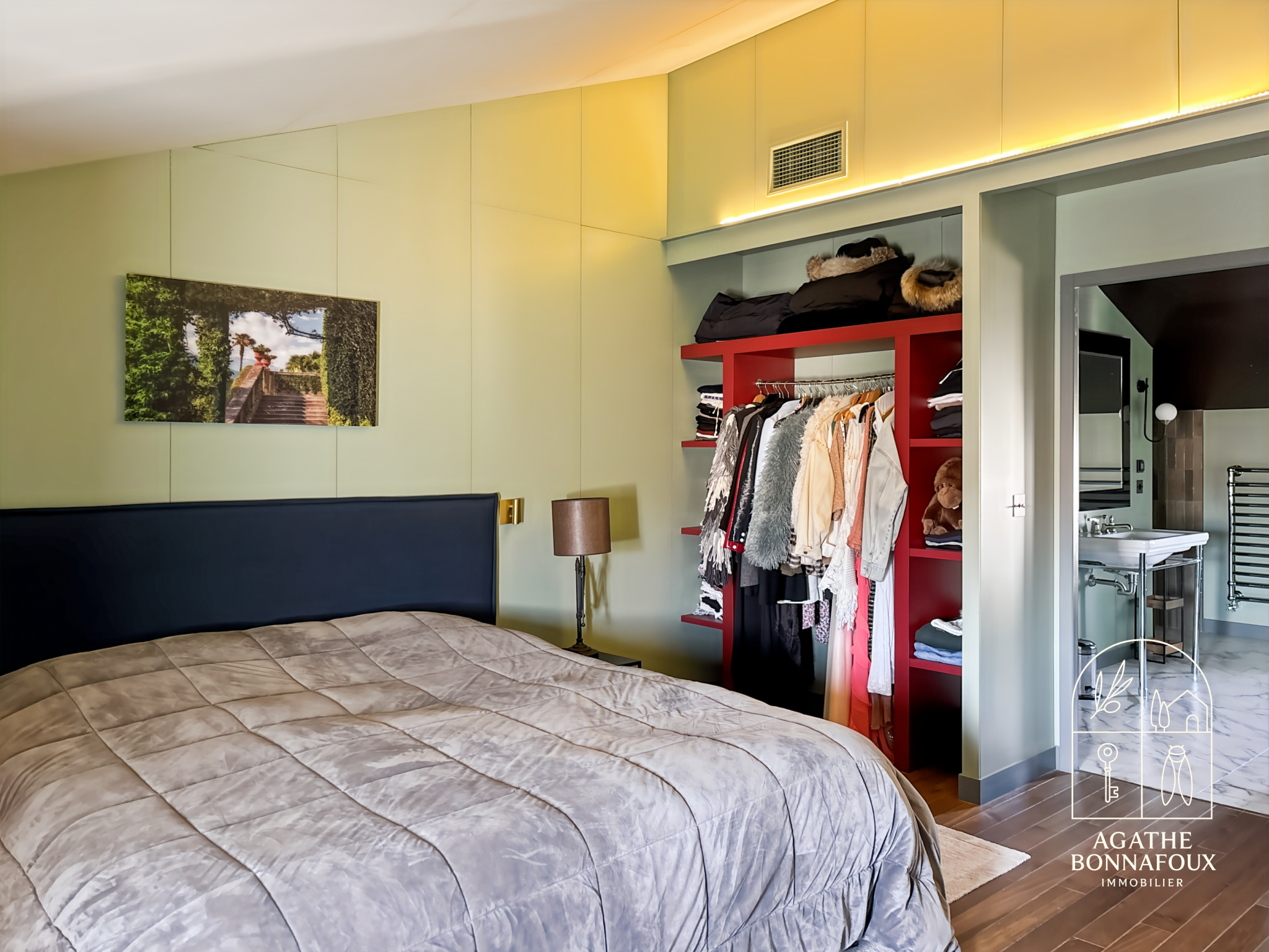 Le premier étage dévoile un salon cinéma ouvert sur une élégante coursive, ainsi qu’une somptueuse suite parentale avec dressing sur mesure et salle de bains complète (baignoire, douche, toilettes).