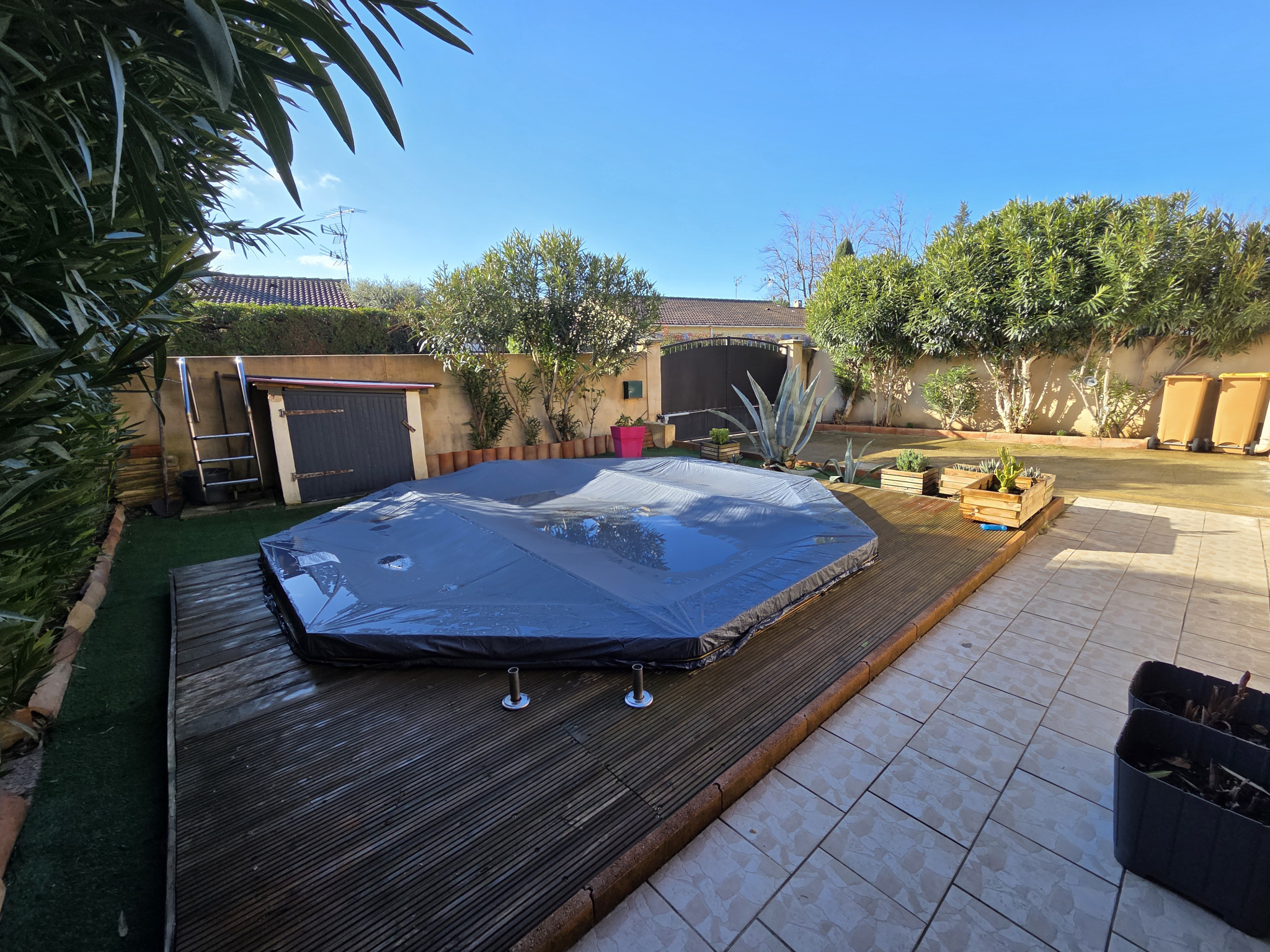 Le jardin clos et arboré accueil une jolie piscine hors sol enterrée en bois, une terrasse semi couverte ainsi q'une cour à l'arrière de la maison côté Nord.