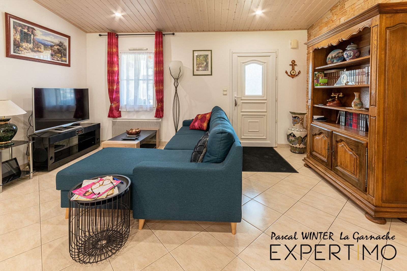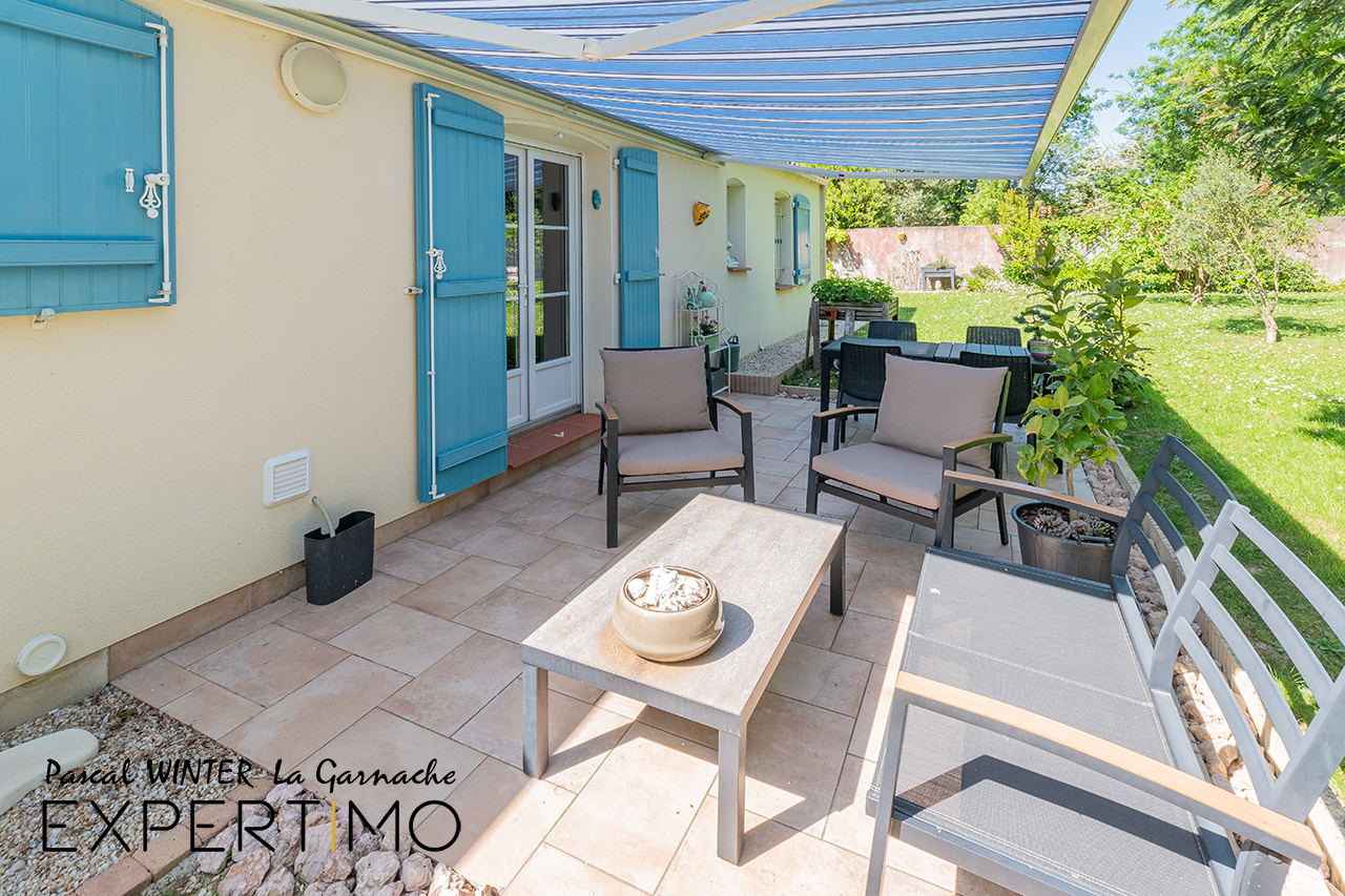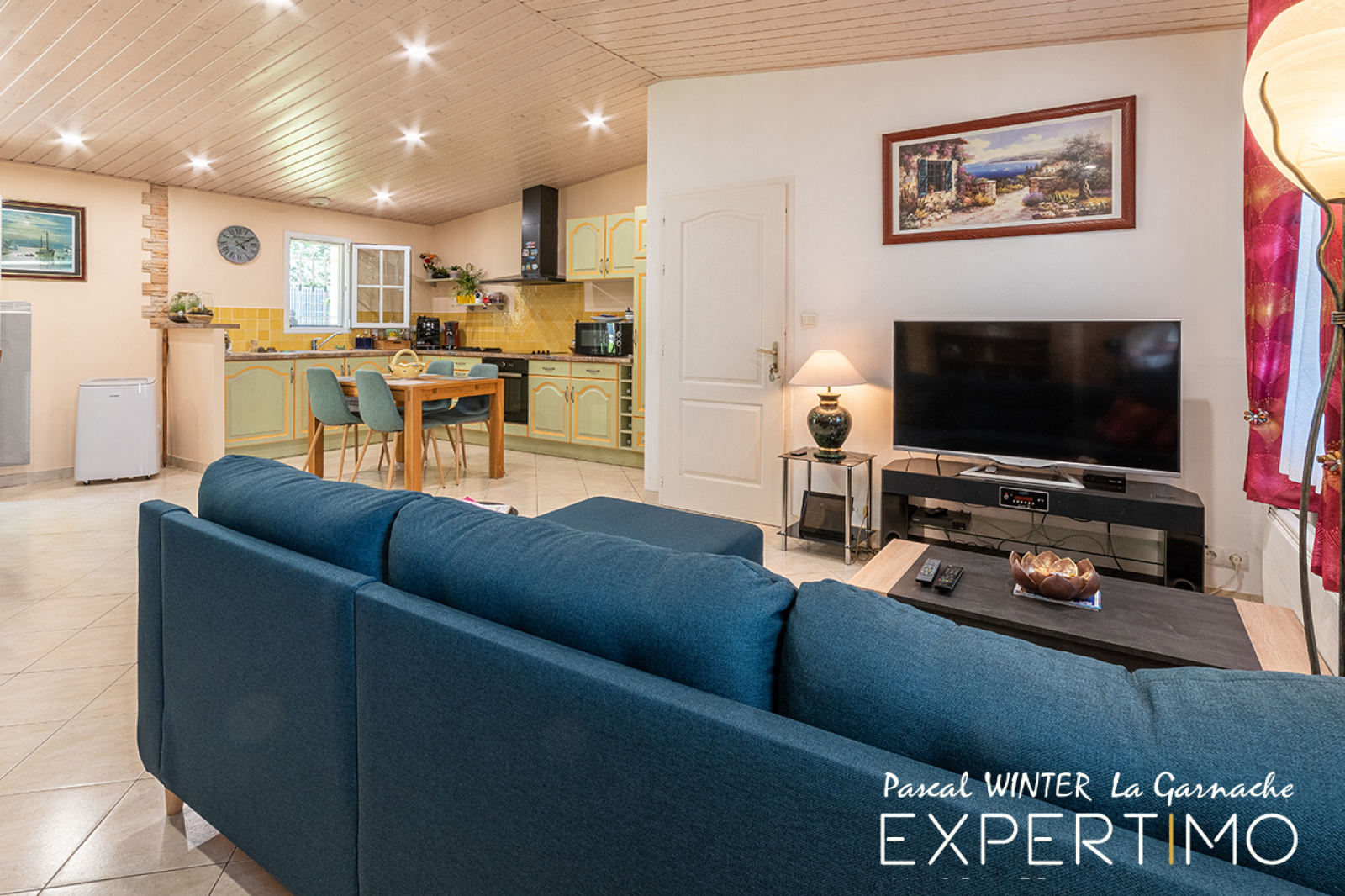 L'espace vie se compose d'un salon-séjour avec cuisine ouverte, avec accès sur la terrasse arrière entièrement carrelée à l'ombre de son store banne électrique.