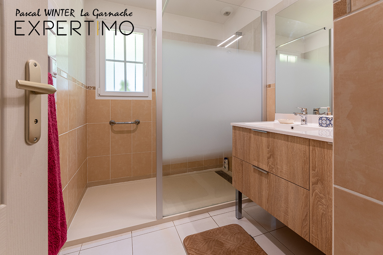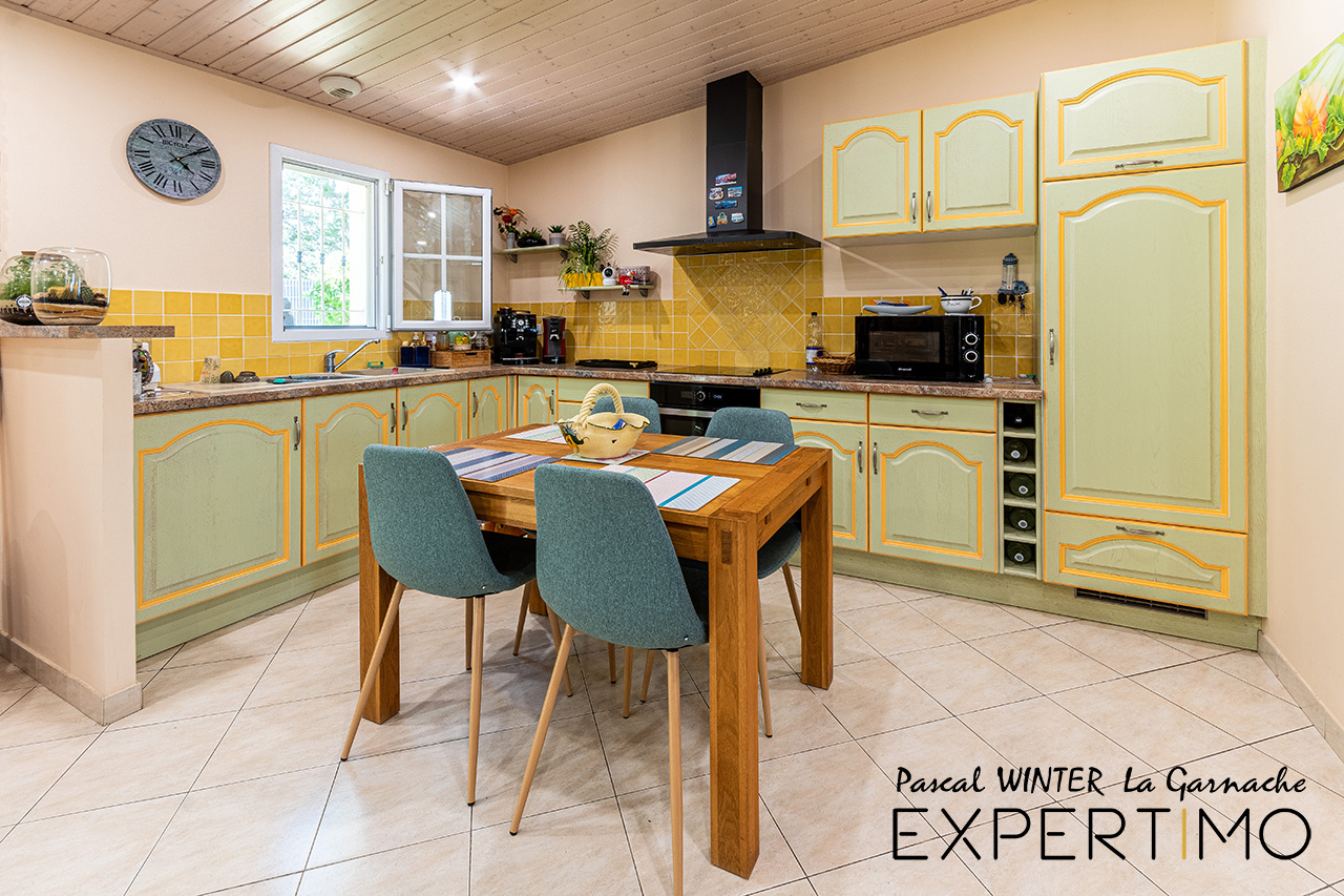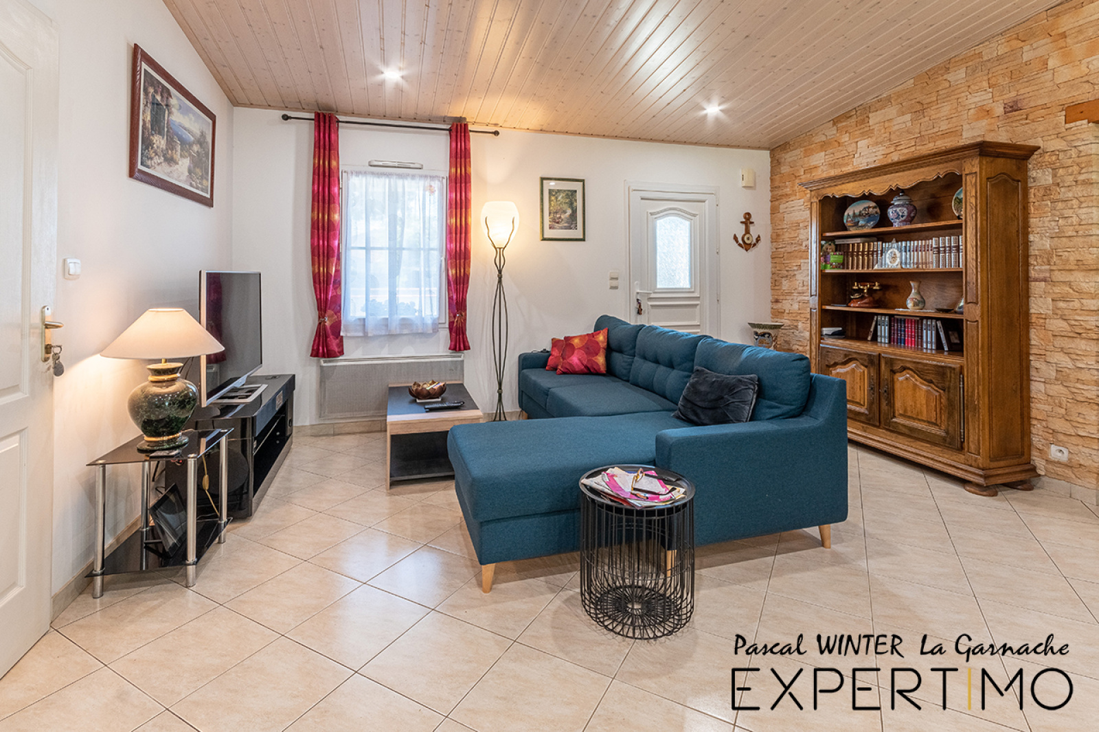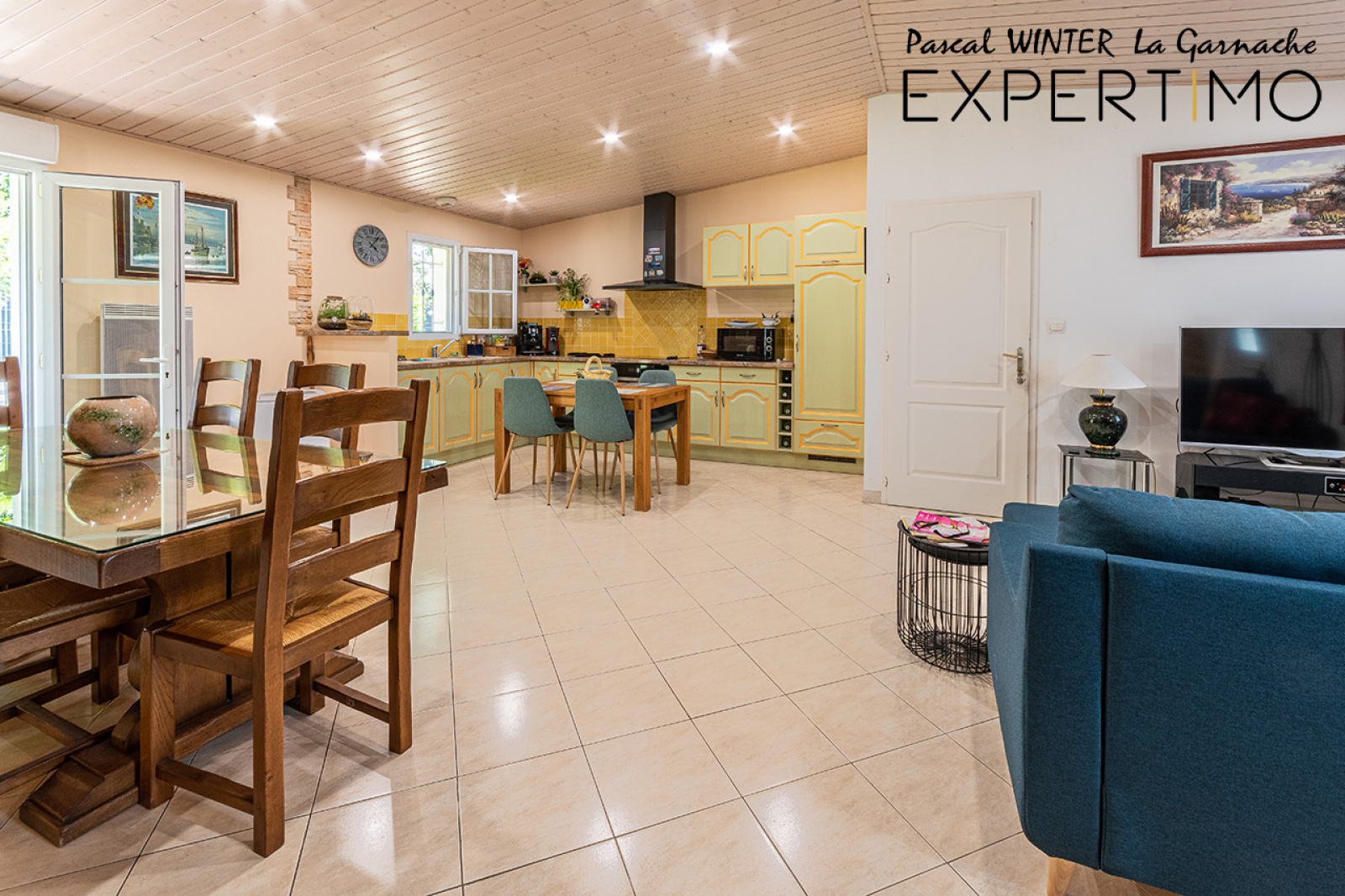 L'espace vie se compose d'un salon-séjour avec cuisine ouverte, avec accès sur la terrasse arrière entièrement carrelée à l'ombre de son store banne électrique.