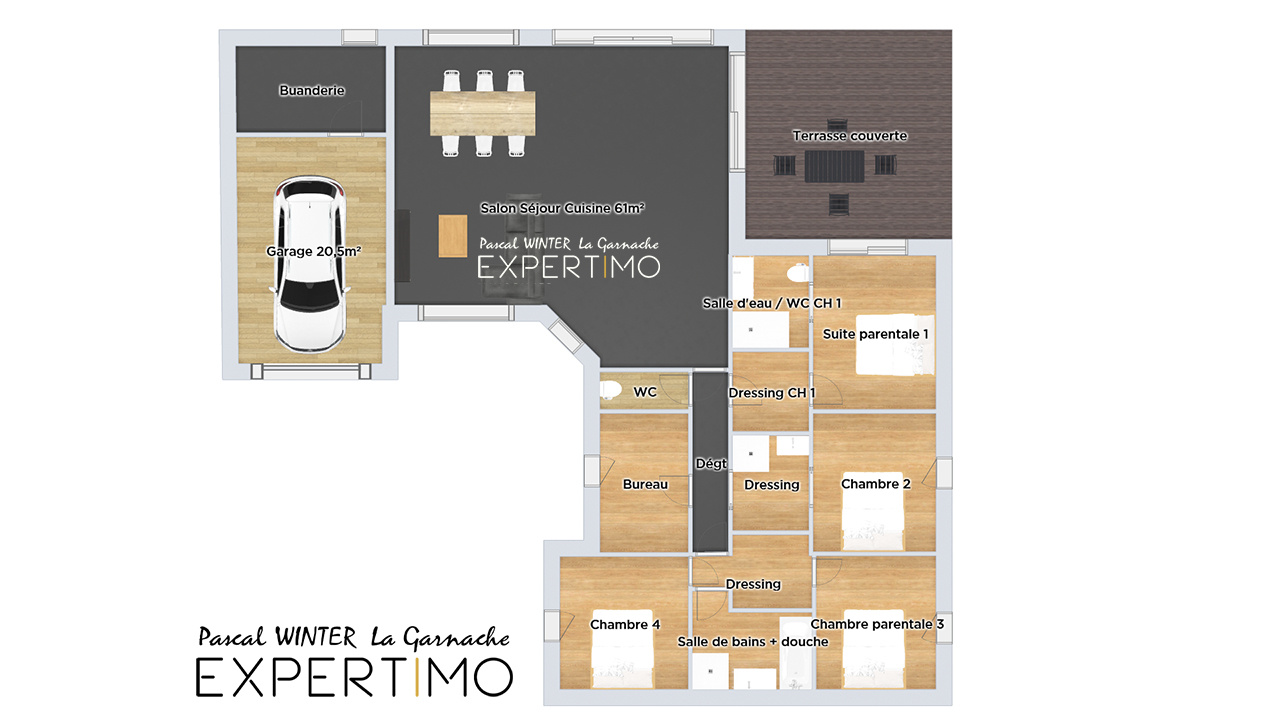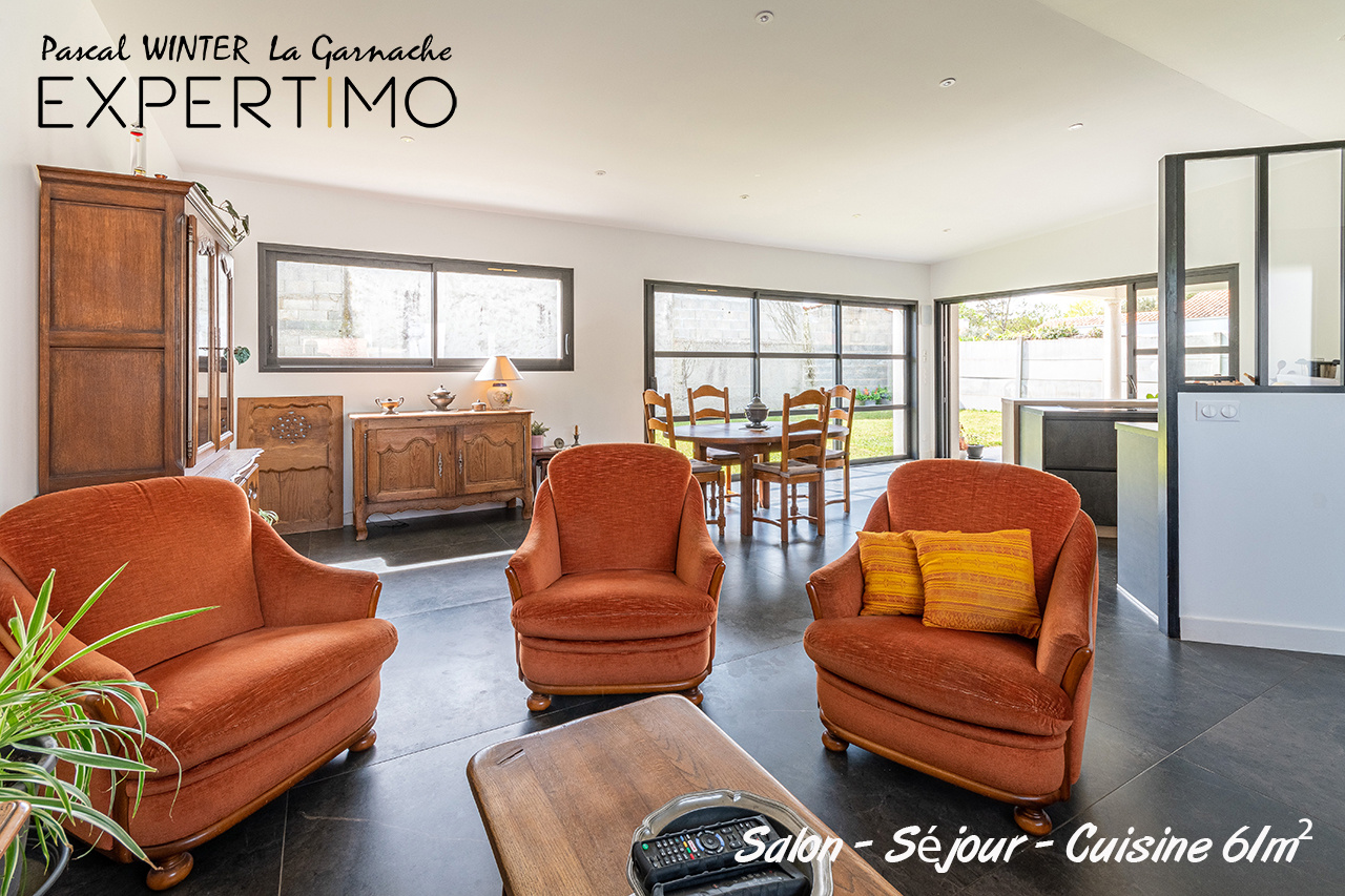 Un vaste pièce de vie de 61m² avec cuisine ouverte moderne, très lumineuse grâce à ses 2 grandes baies vitrées accédant sur une terrasse couverte extérieure de 25m². un cellier et un garage isolé de 20m² complètent l'espace jour.