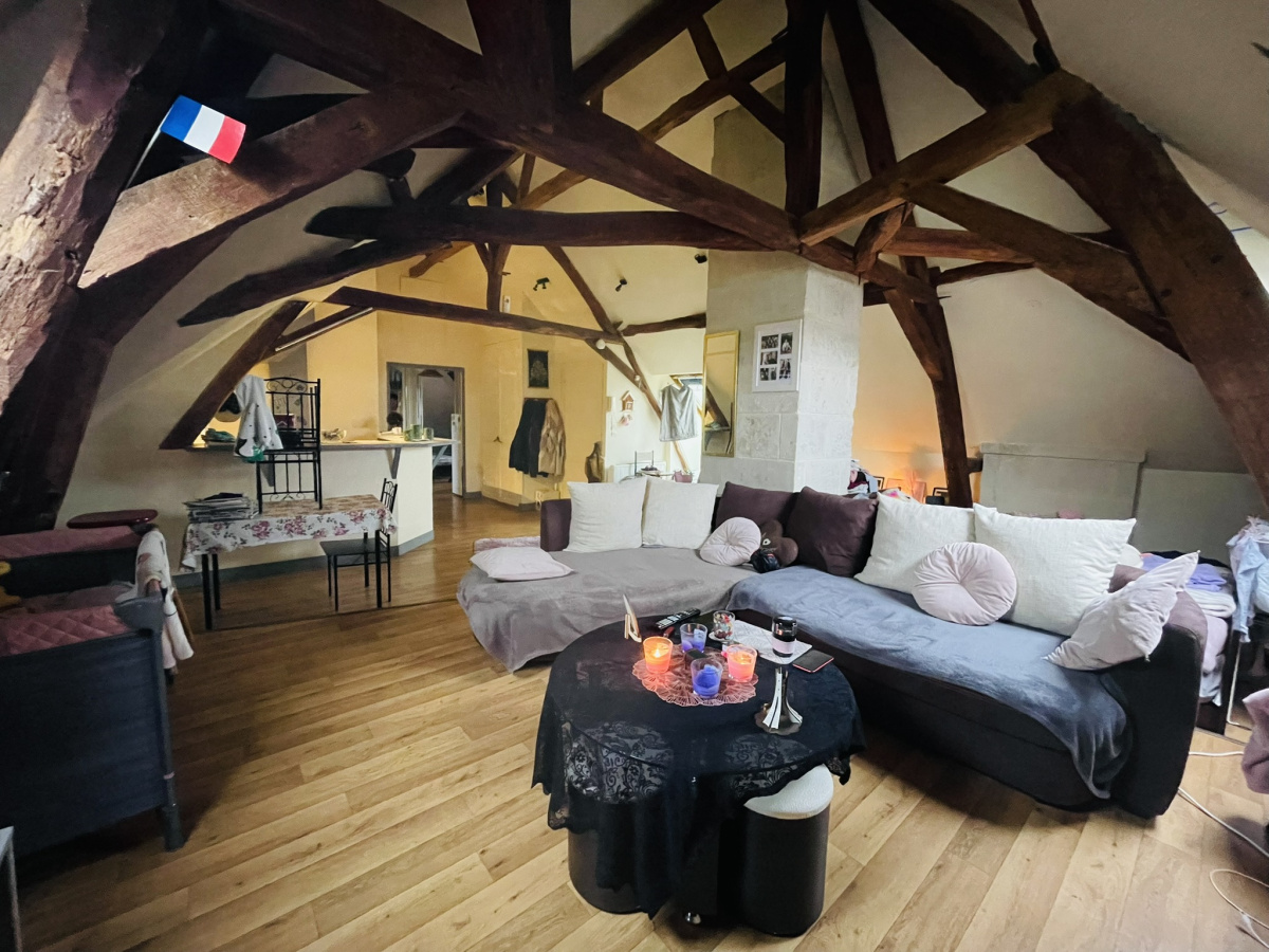 CENTRE VILLE DE CHATELLERAULT idéalement situé proche de la Mairie et des commerces, venez découvrir situé au 3ème étage, le charme et le cachet avec charpente apparente de ce bel appartement de 63.42 m2 Loi Carrez composé d'une agréable, lumineuse et grande pièce de vie avec kitchenette, d'un dégagement avec placard, de 2 coins nuit ou bureaux, d'une salle d'eau avec WC et d'une cave en sous sol. Actuellement bail en cours loué 550€ charges comprises, copropriété de 9 lots. Au plaisir de vous faire visiter.