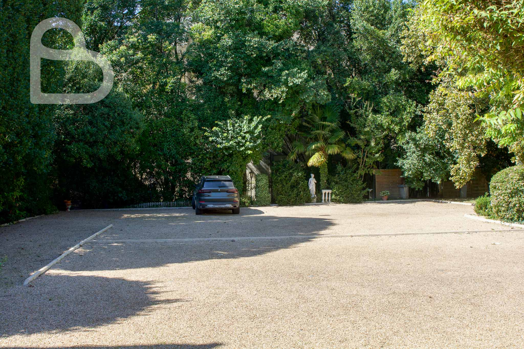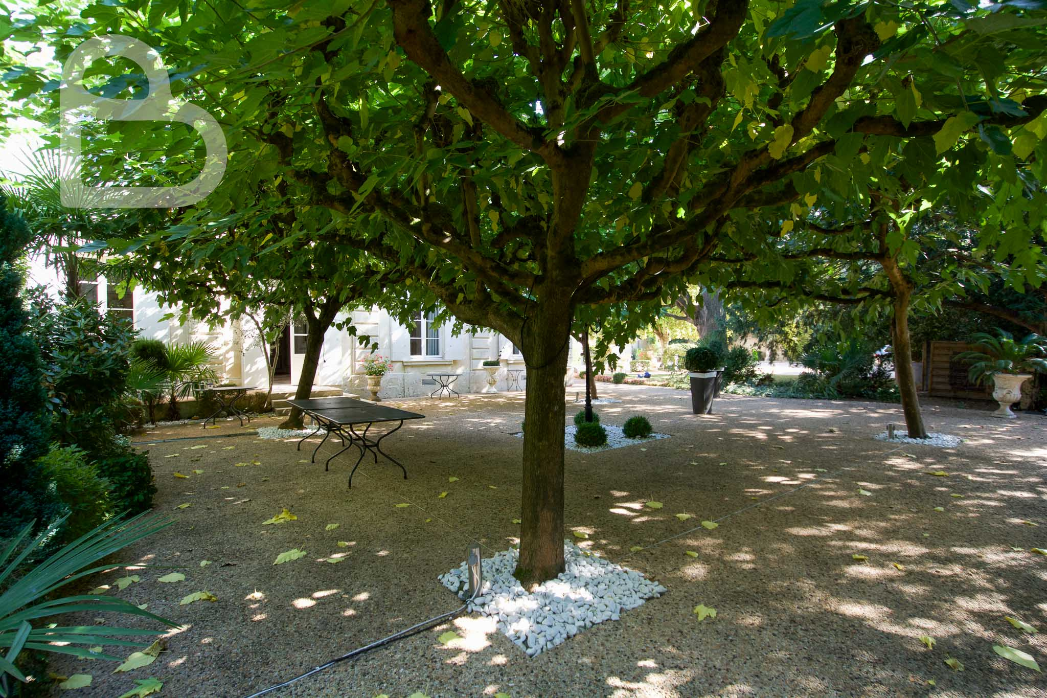 À l’extérieur, la propriété dispose d’un parking pouvant accueillir jusqu’à 20 véhicules, d’une terrasse conviviale ombragée par des mûriers platanes et d’un parc fleuri dominé par un chêne centenaire majestueux.