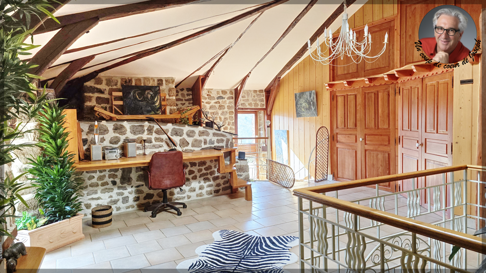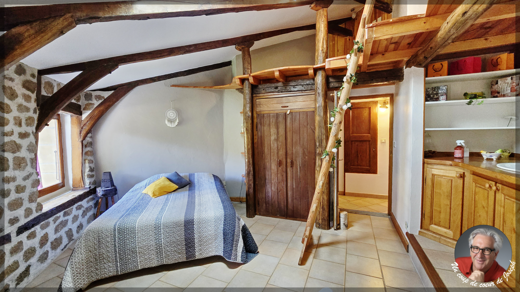 À l’étage, une grande pièce centrale avec bureau intégré, une chambre spacieuse ainsi qu’une salle de bains avec baignoire et douche.