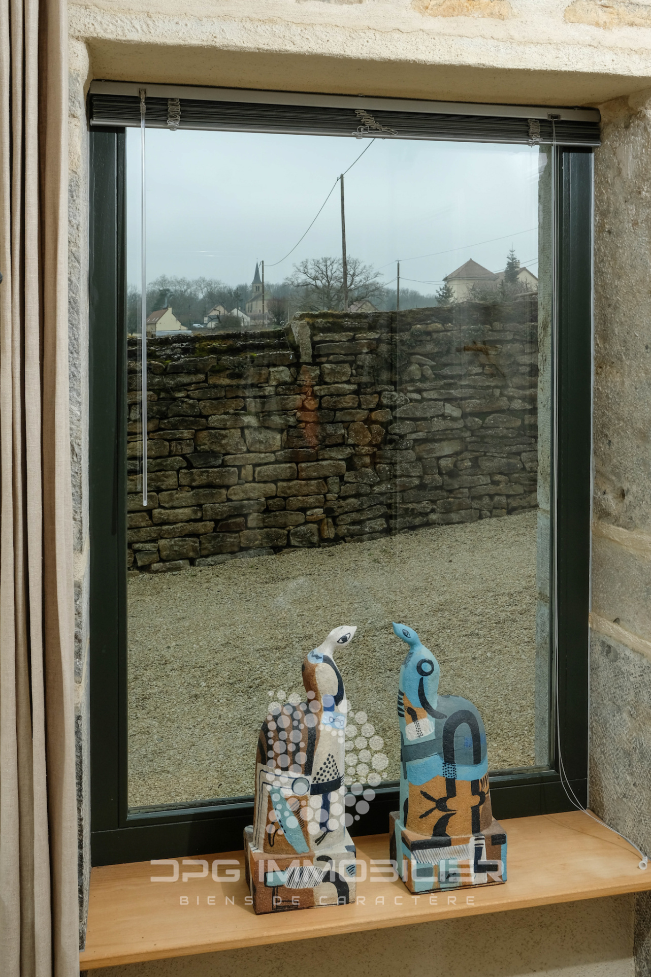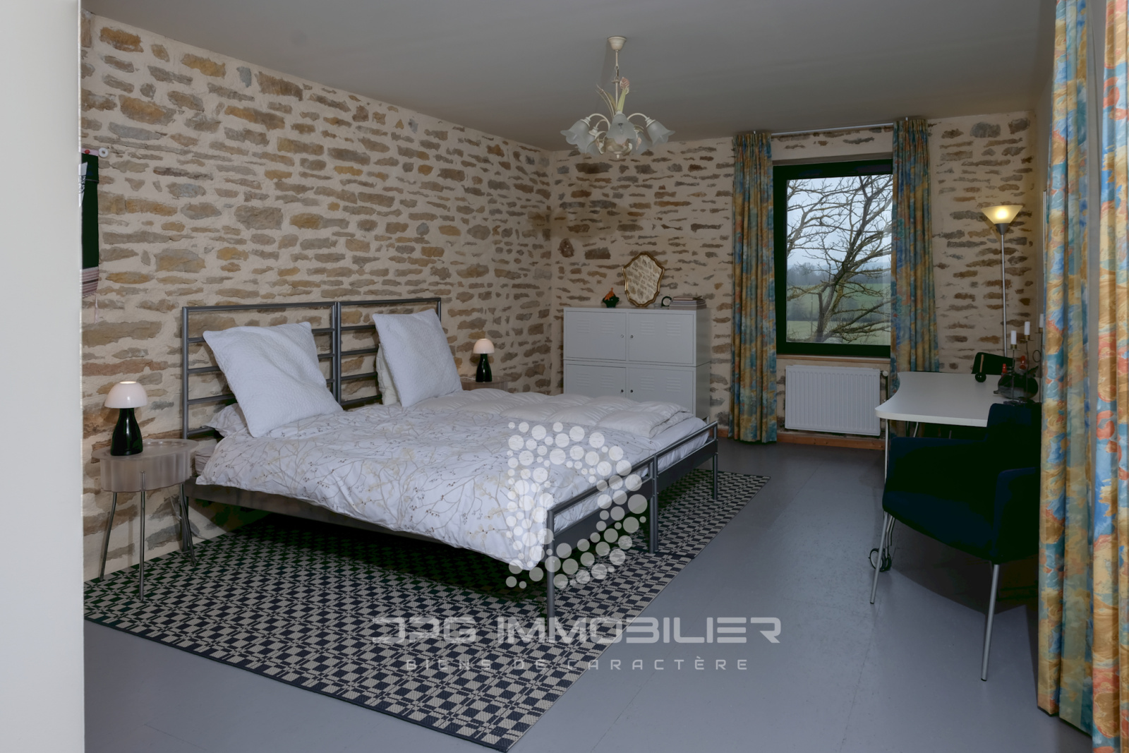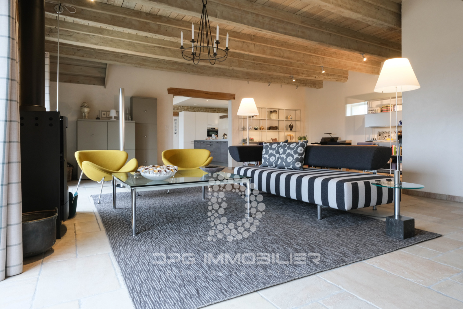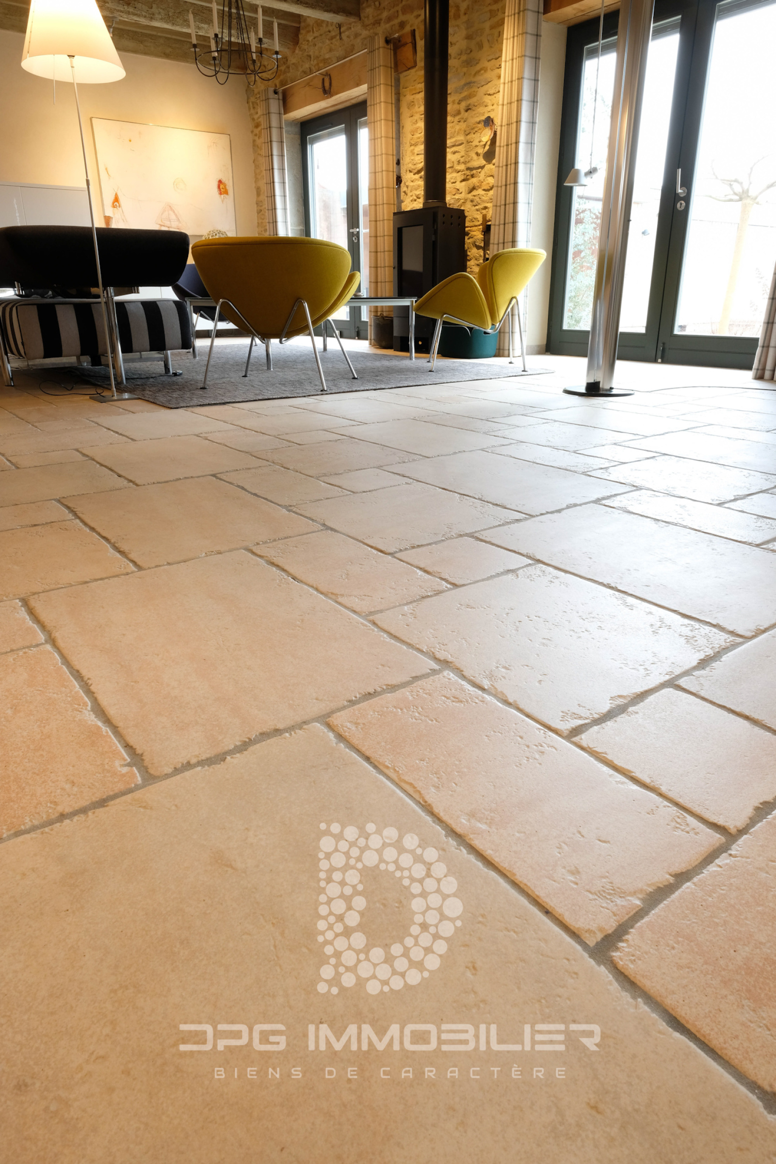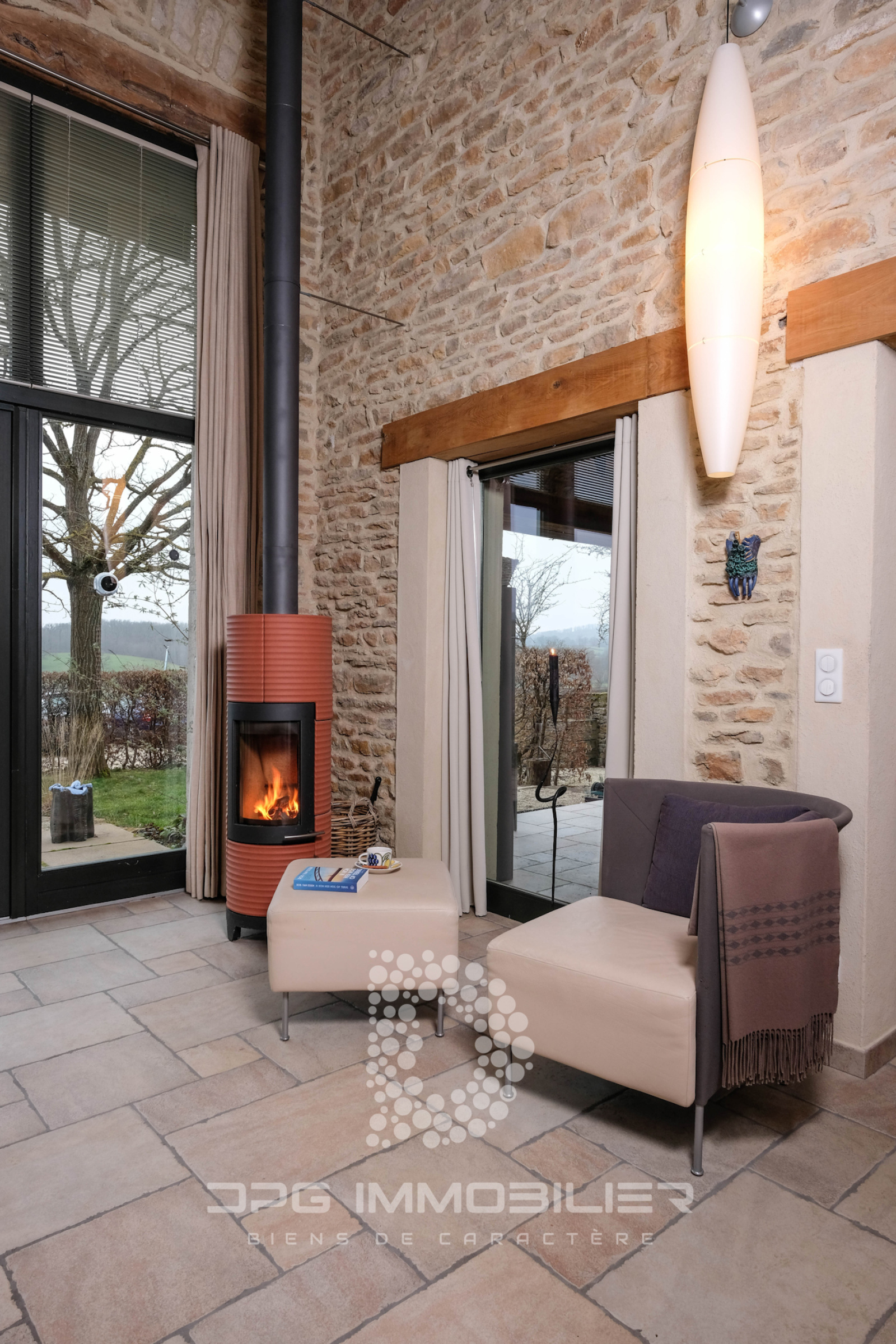 Avec poêle à bois, deux baies vitrées orientées plein Sud, un espace bureau, chauffage par le sol, carrelage en grès Céram imitation pierre de Bourgogne.