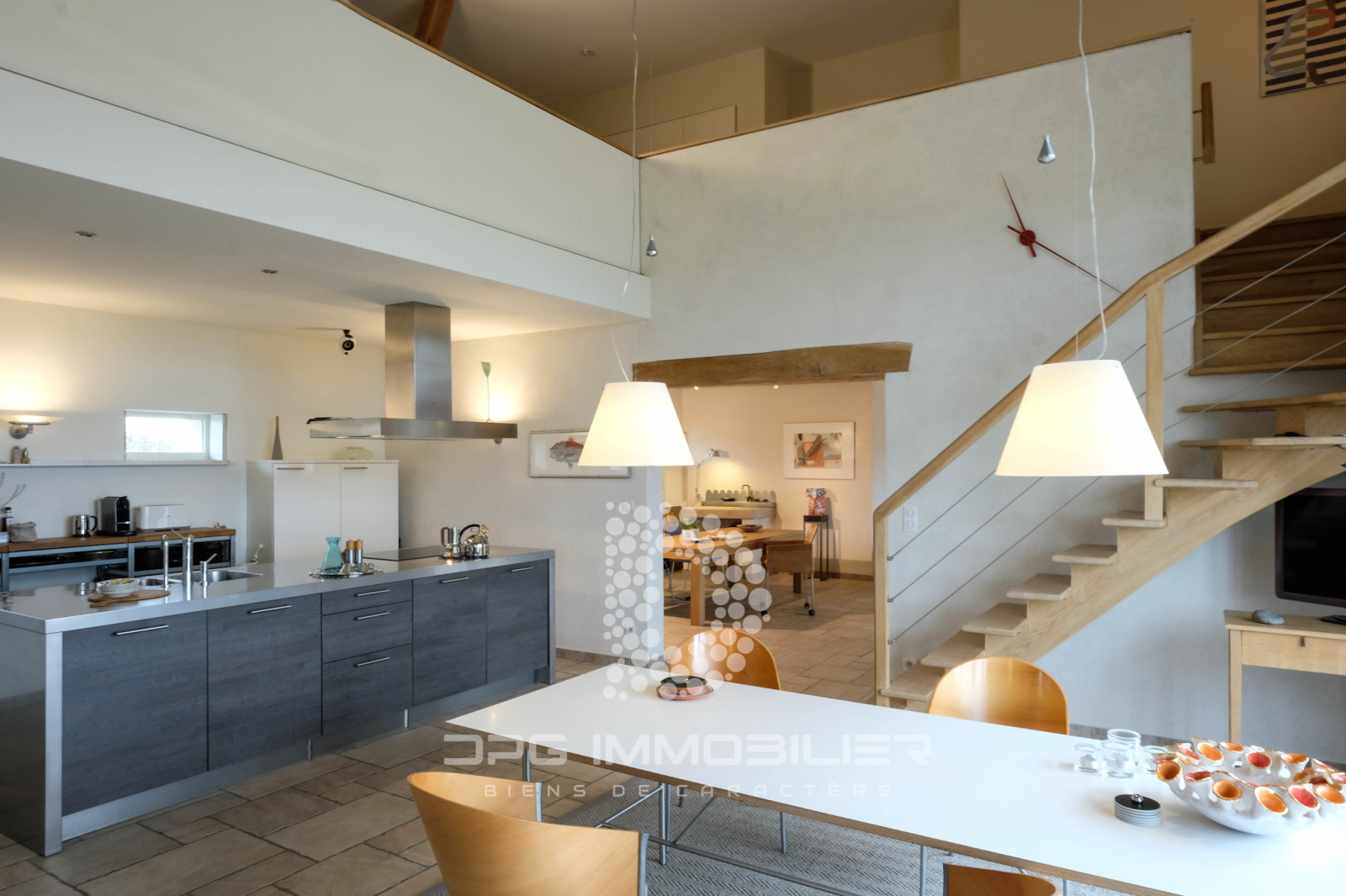 • Une cuisine-salle à manger magistrale, où un îlot central en bois grisé et inox dialogue avec un mobilier intégré toute hauteur, épuré et fonctionnel. Sous la mezzanine, cet espace est une véritable pièce maîtresse, pensée pour la convivialité et la fluidité des gestes.
