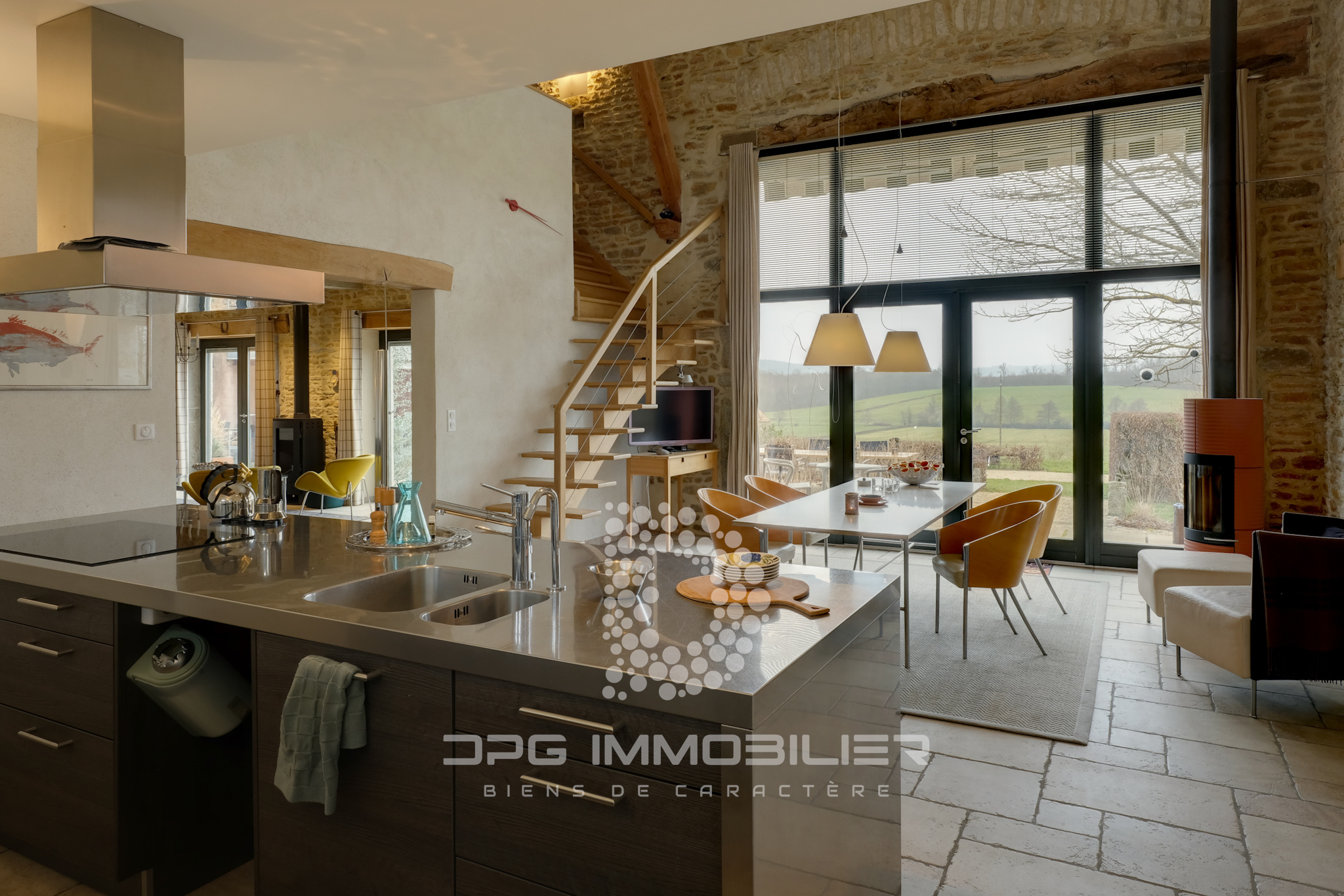 Grande baie vitrée avec double vitrage feuilleté, poêle à bois, îlot central, meuble toute hauteur en MDF blanc laqué, mezzanine, escalier en chêne blond