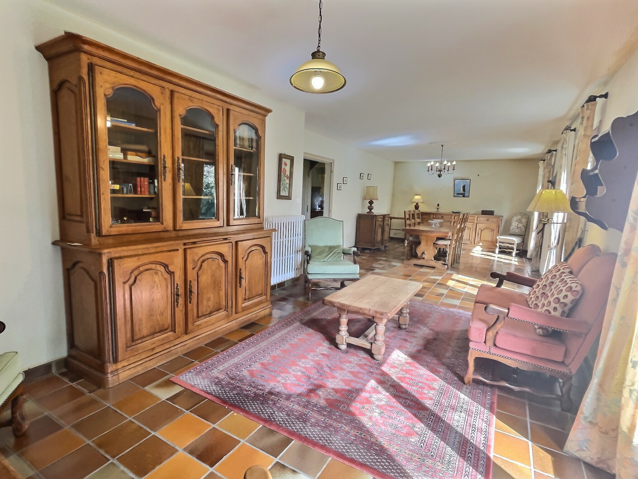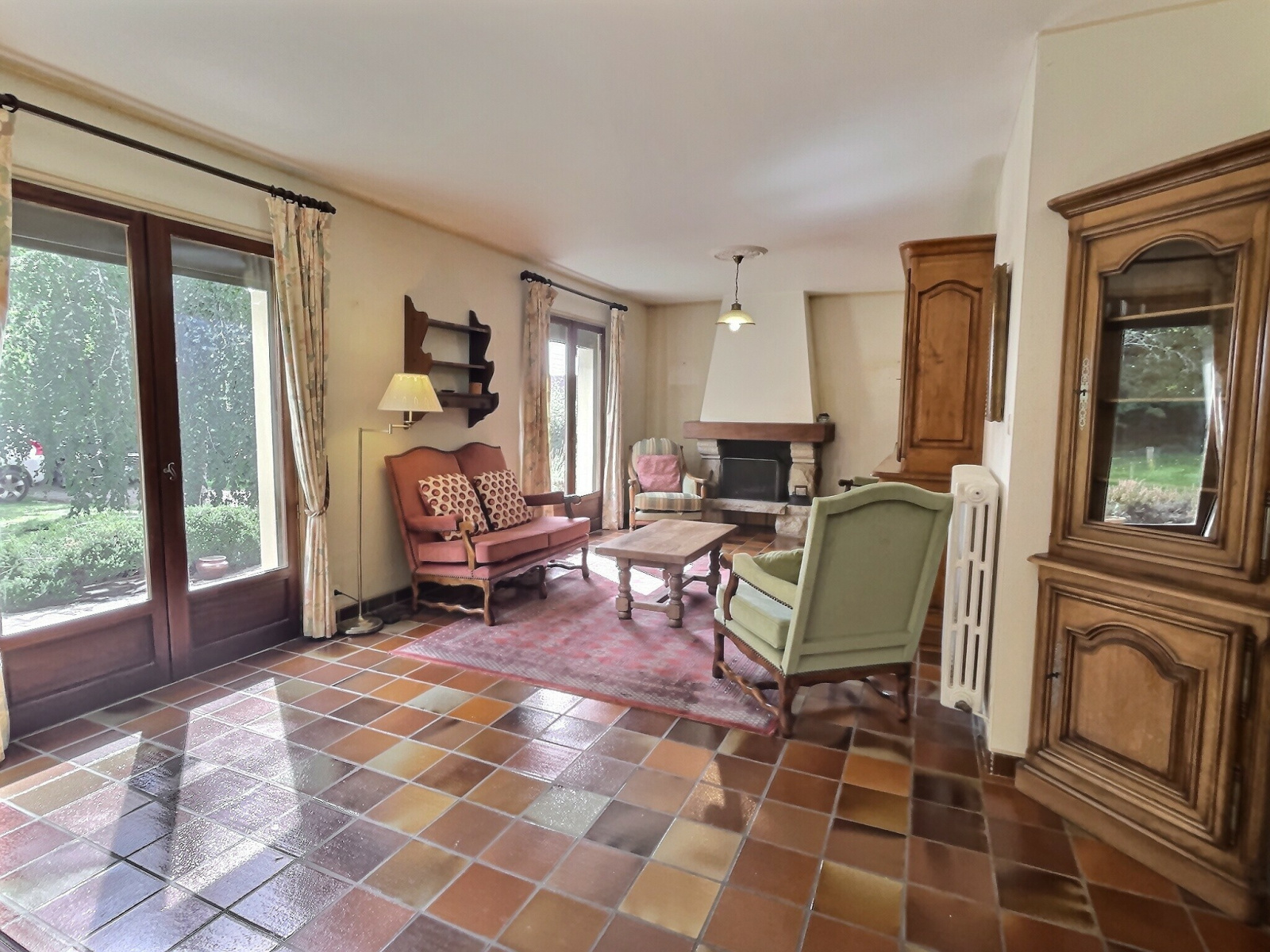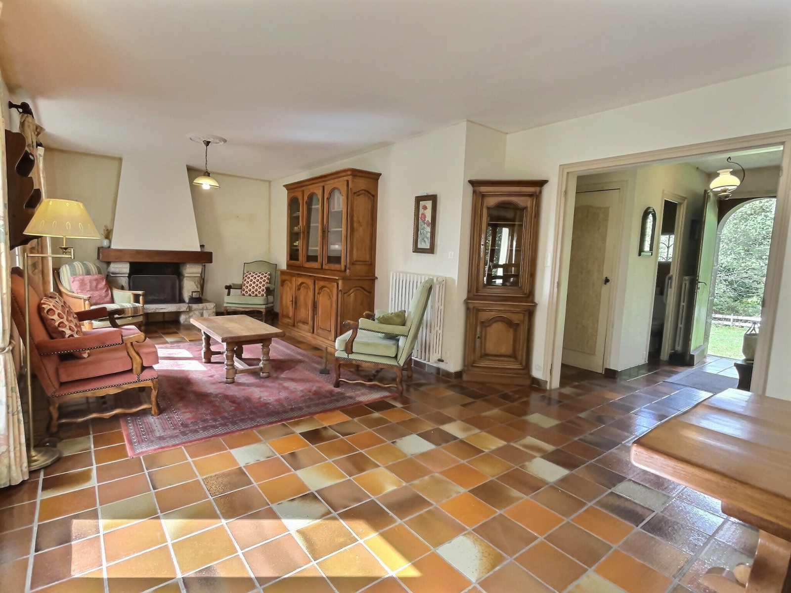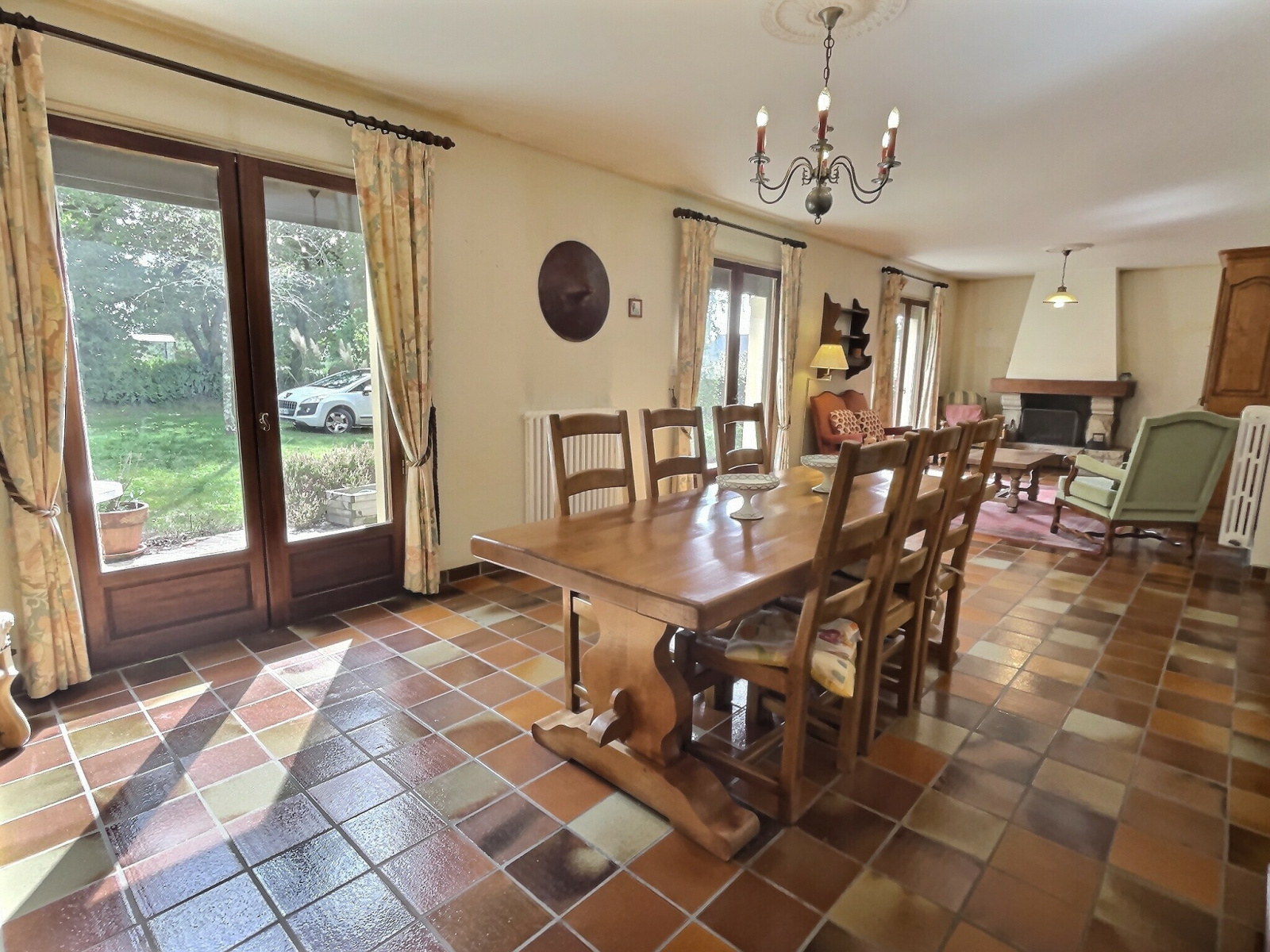- un séjour avec cheminée de 42 m2, très lumineux : exposition Sud par trois baies vitrés avec accès direct au jardin (terrasse en pierres)