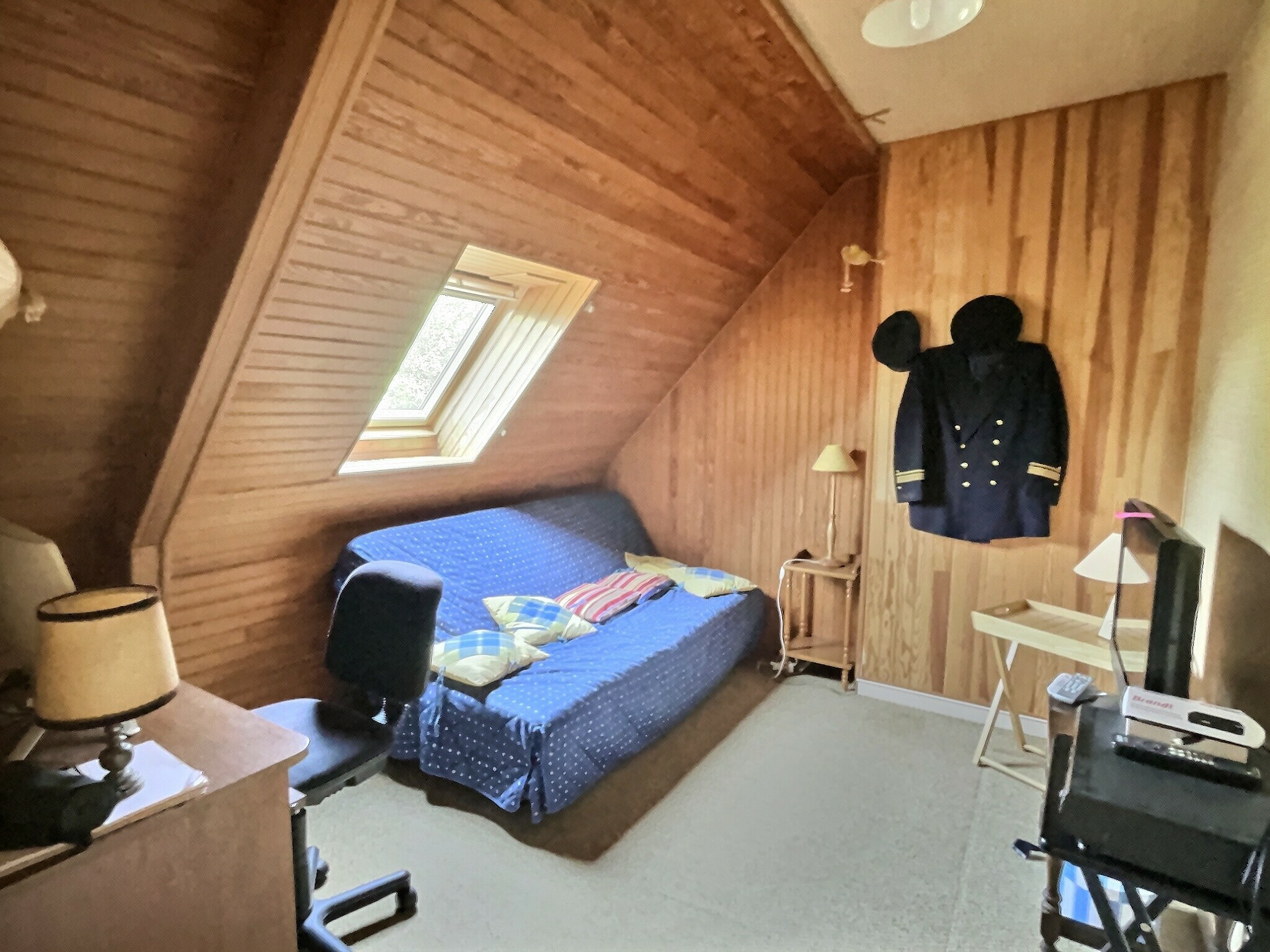 Au premier étage mansardé et lambrissé, un dégagement distribue :