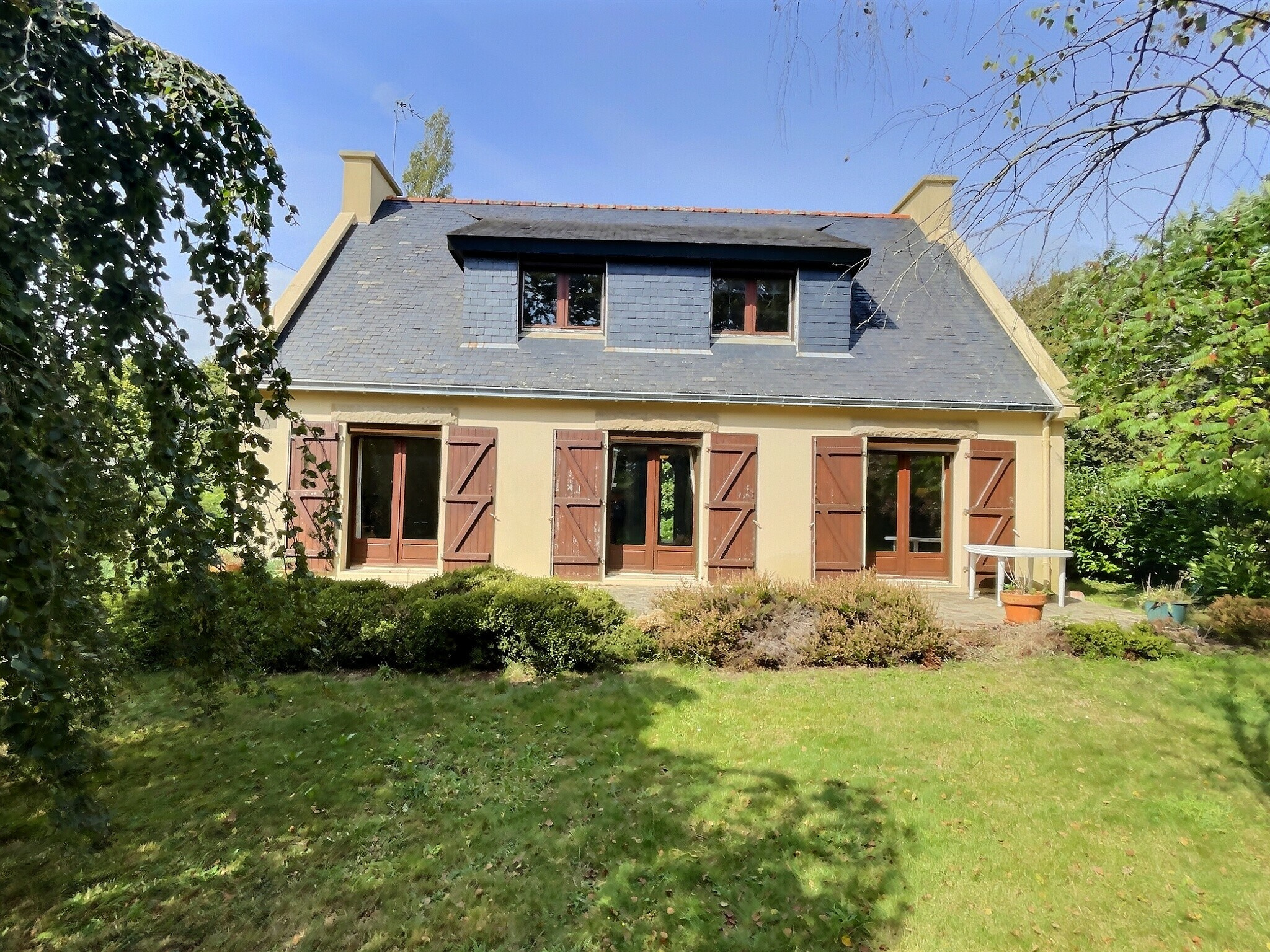 Aujourd’hui, je vous propose de découvrir, en exclusivité, cette maison néo-bretonne de bonne qualité, datant de 1974 sur un terrain arboré et clos de 1100 m2 à 3 kms de Trégunc et 5/7 kms du port dynamique de Concarneau avec ses jolies plages.