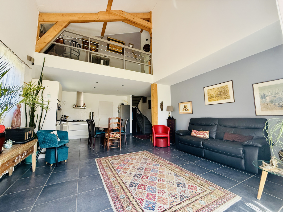 Au rez-de-chaussée, la villa dispose d'une chambre spacieuse, d'une salle d'eau avec toilettes, d'une cuisine entièrement équipée ouverte sur une pièce de vie cathédrale, baignée de lumière, prolongée par une terrasse donnant sur le jardin, idéalement exposée. Cellier faisant office de buanderie donnant sur l'arrière de la maison.
