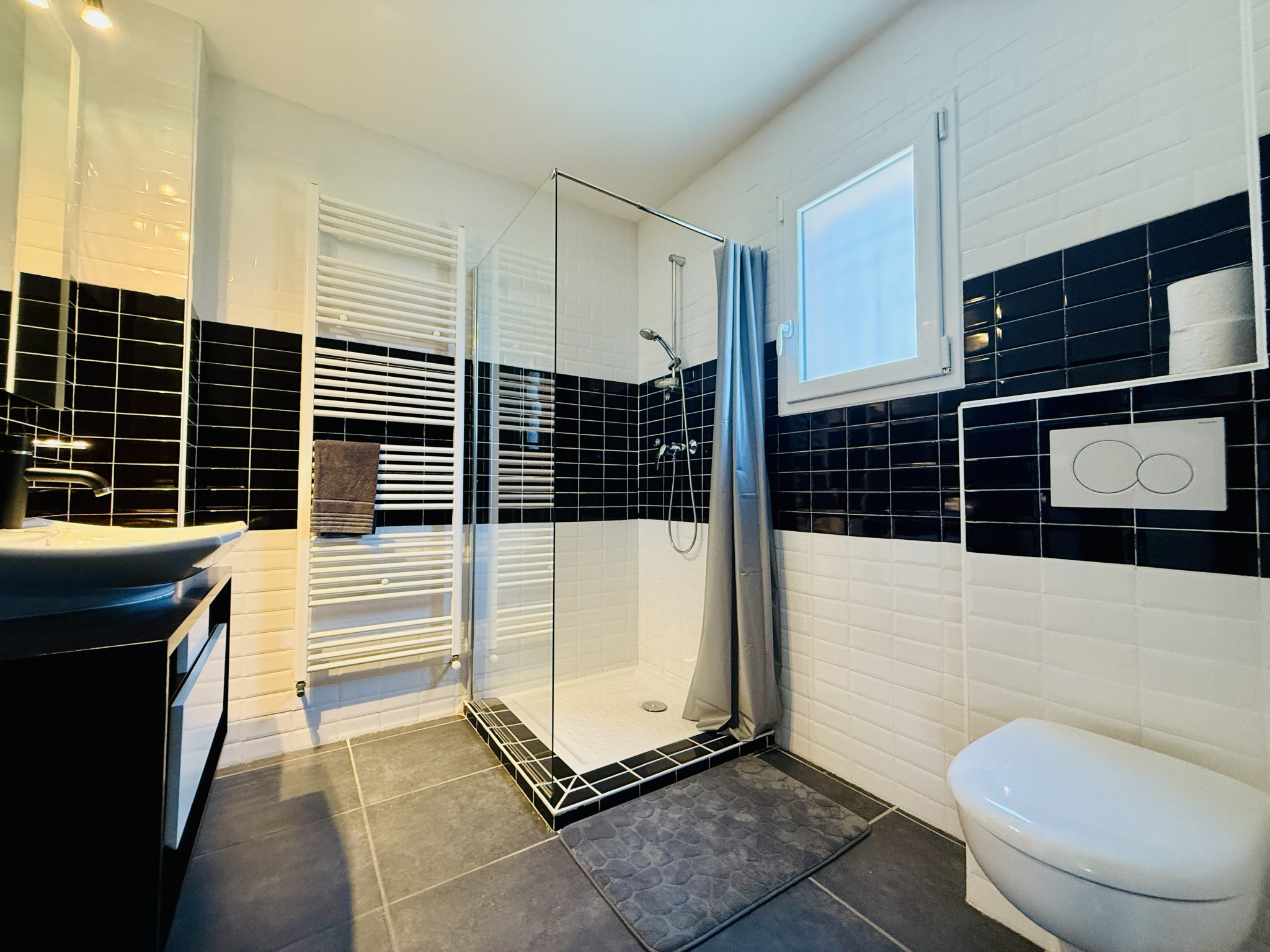 À l'étage, deux chambres confortables, une mezzanine donnant sur le séjour ainsi qu'une grande salle de bains avec balnéo, douche et toilettes.