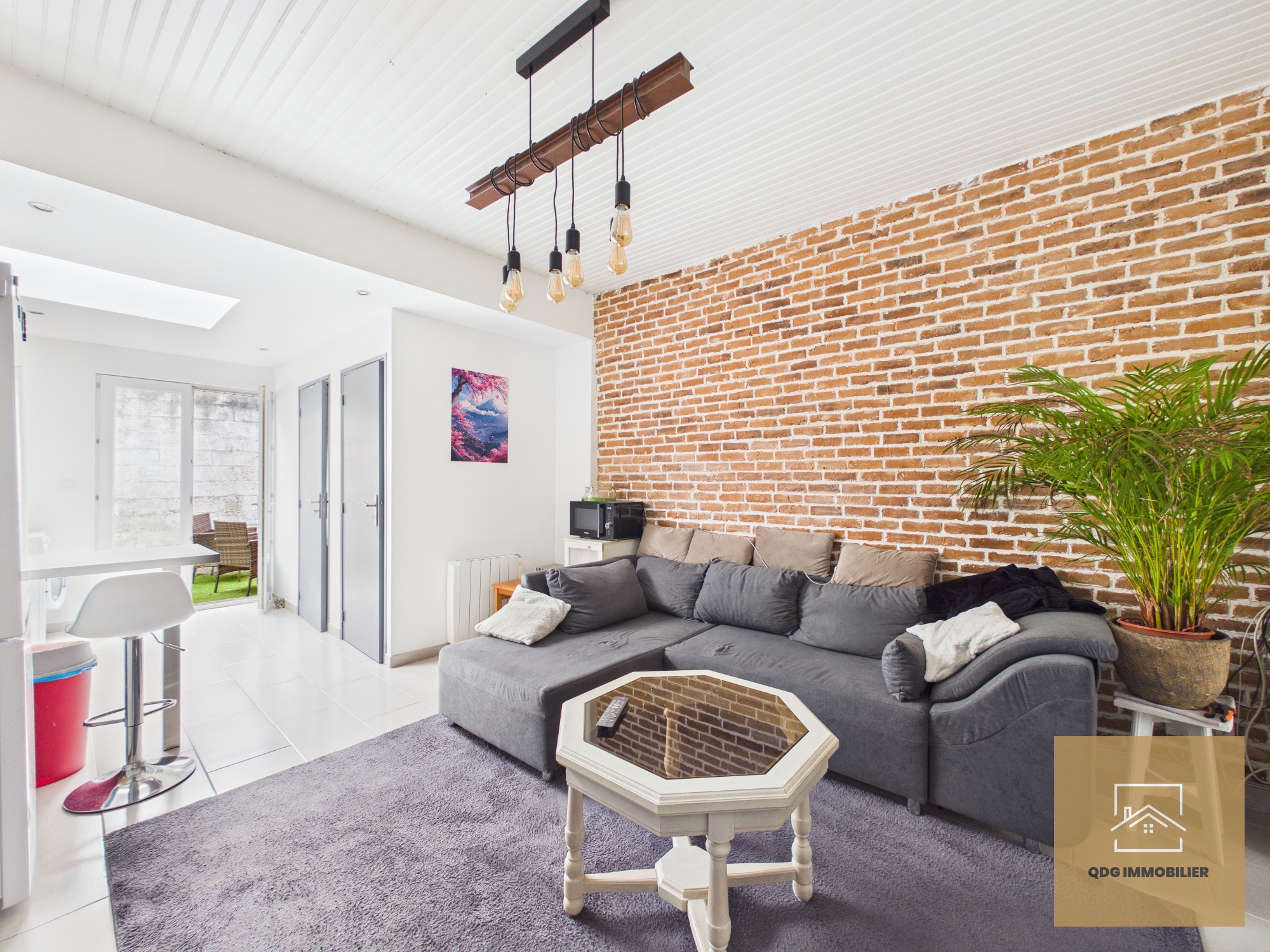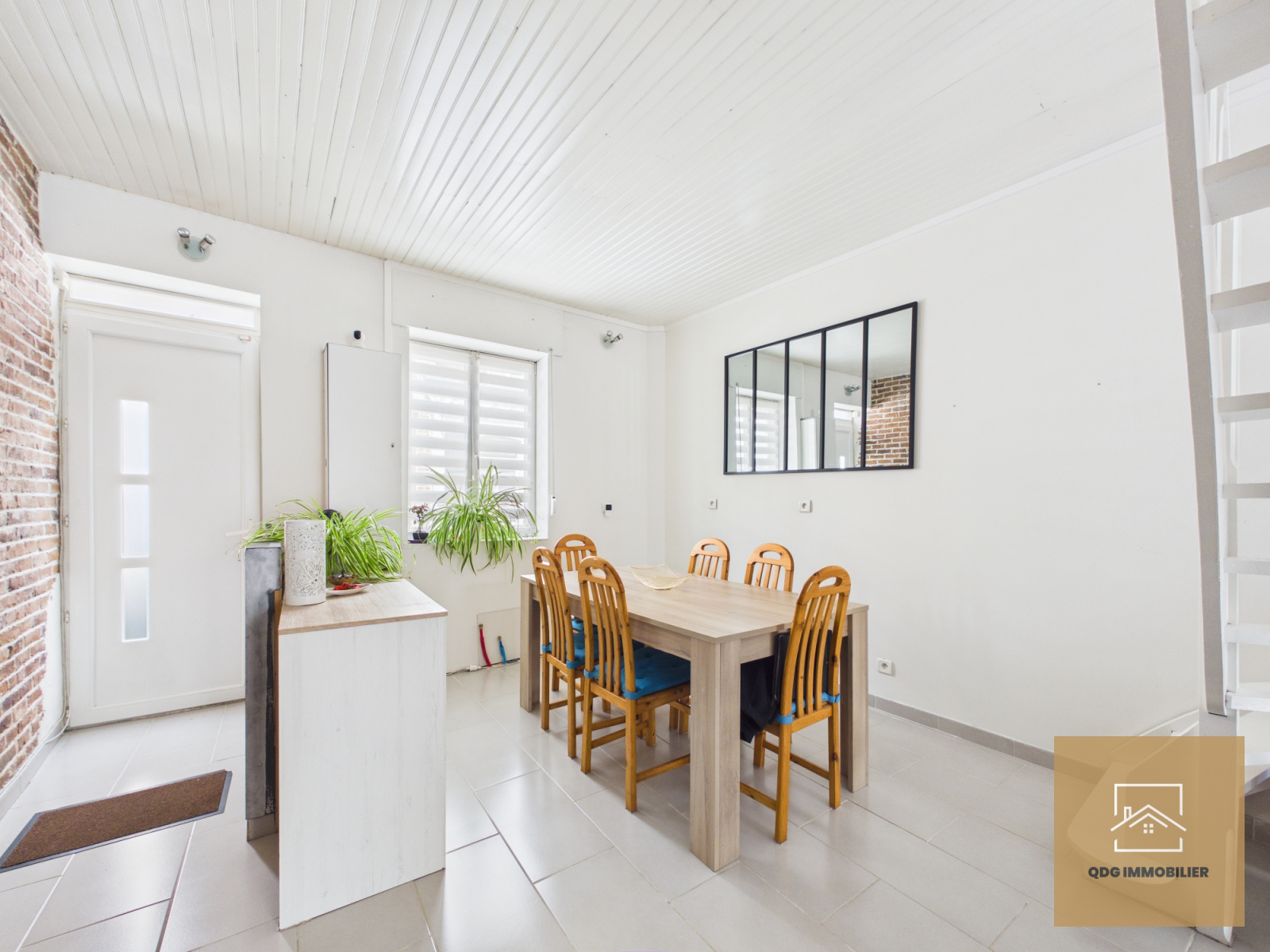 Le rez-de-chaussée se compose d’une pièce de vie agréable, avec un mur en briques apparentes apportant du cachet, ainsi que d’une cuisine récente, aménagée et équipée.