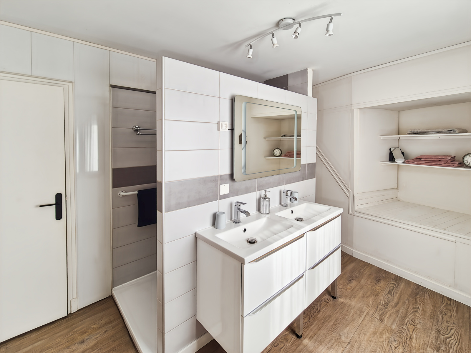 Douche avec double vasque et WC sanibroyeur