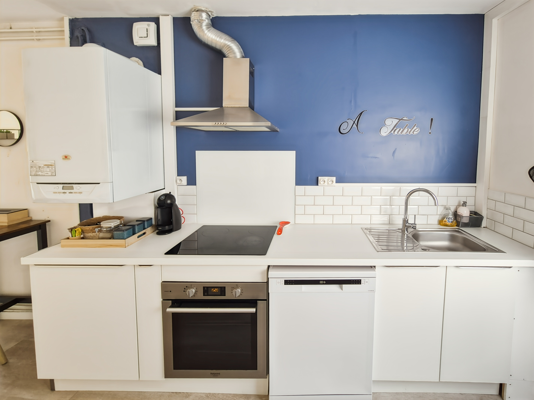 Cuisine équipée : four, plaque gaz, hotte et lave-vaisselle