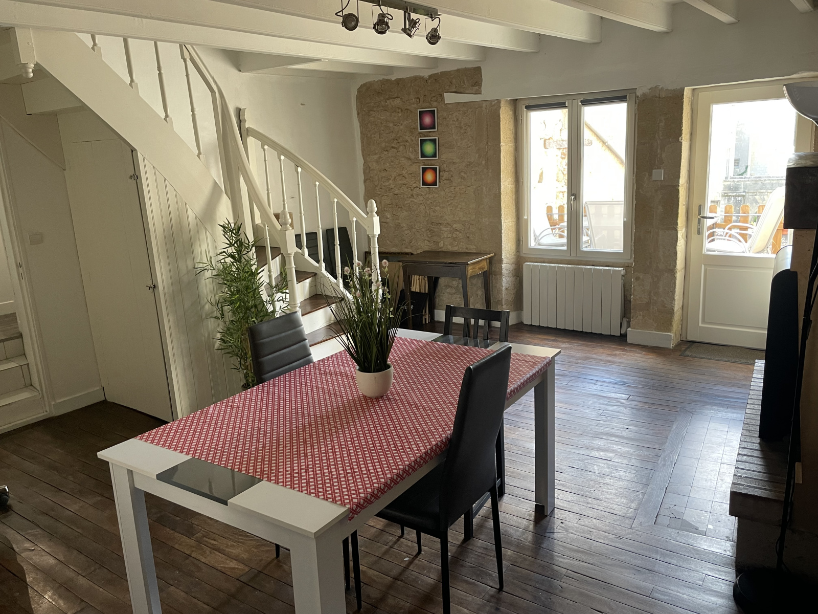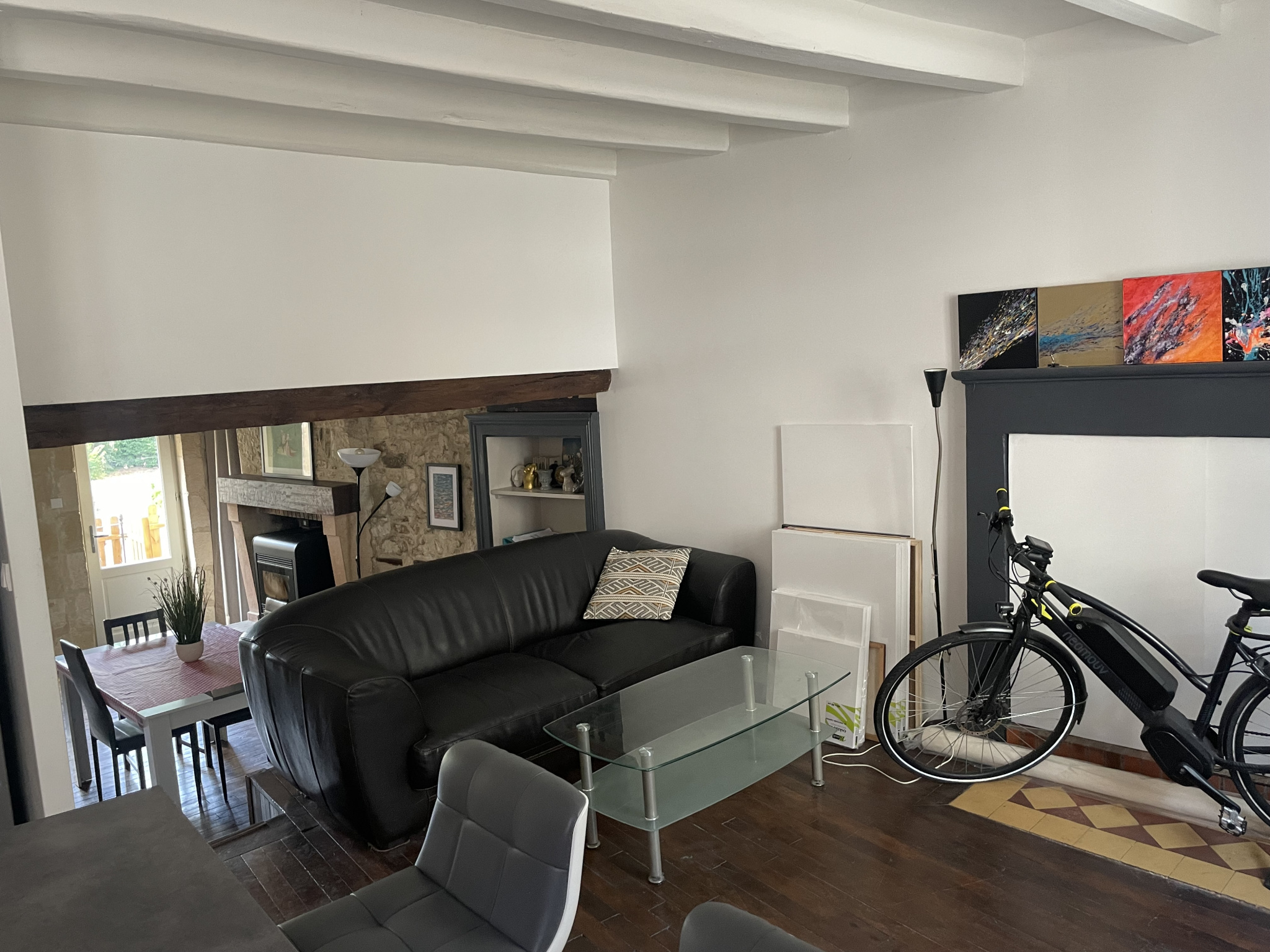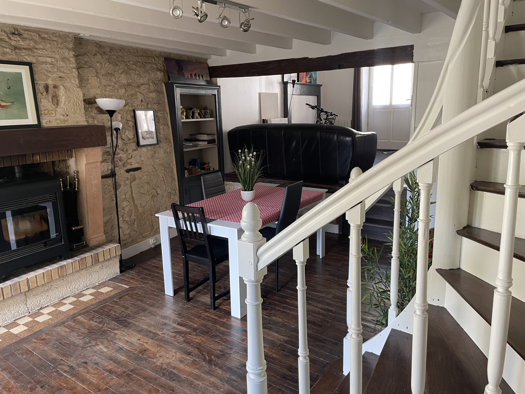 Elle se compose d'une entrée par la Salle à Manger ouverte sur la Cuisine aménagée et semi-équipée, d'un Salon avec poêle à granules de 20 m2, d'une Salle d'eau avec WC. Le Salon s'ouvre sur la Terrasse suspendue qui fait face aux tours du Château !