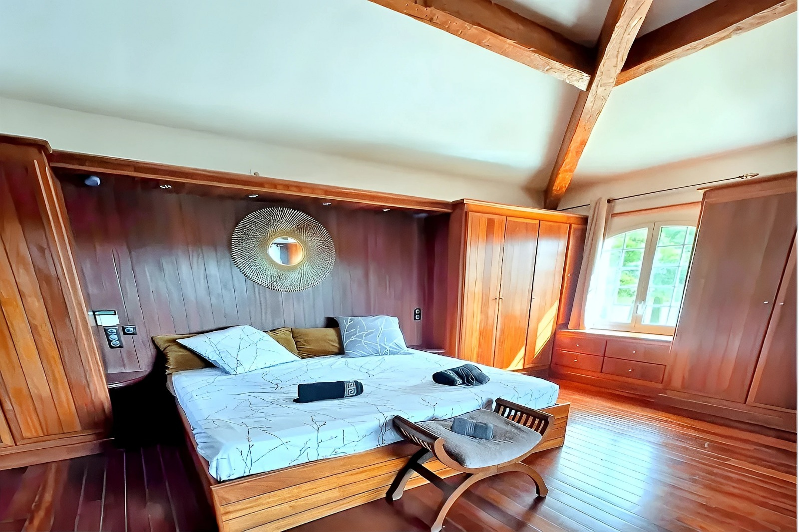 - A l’étage : chambre parentale avec jacuzzi, salle de bain avec douche et wc
