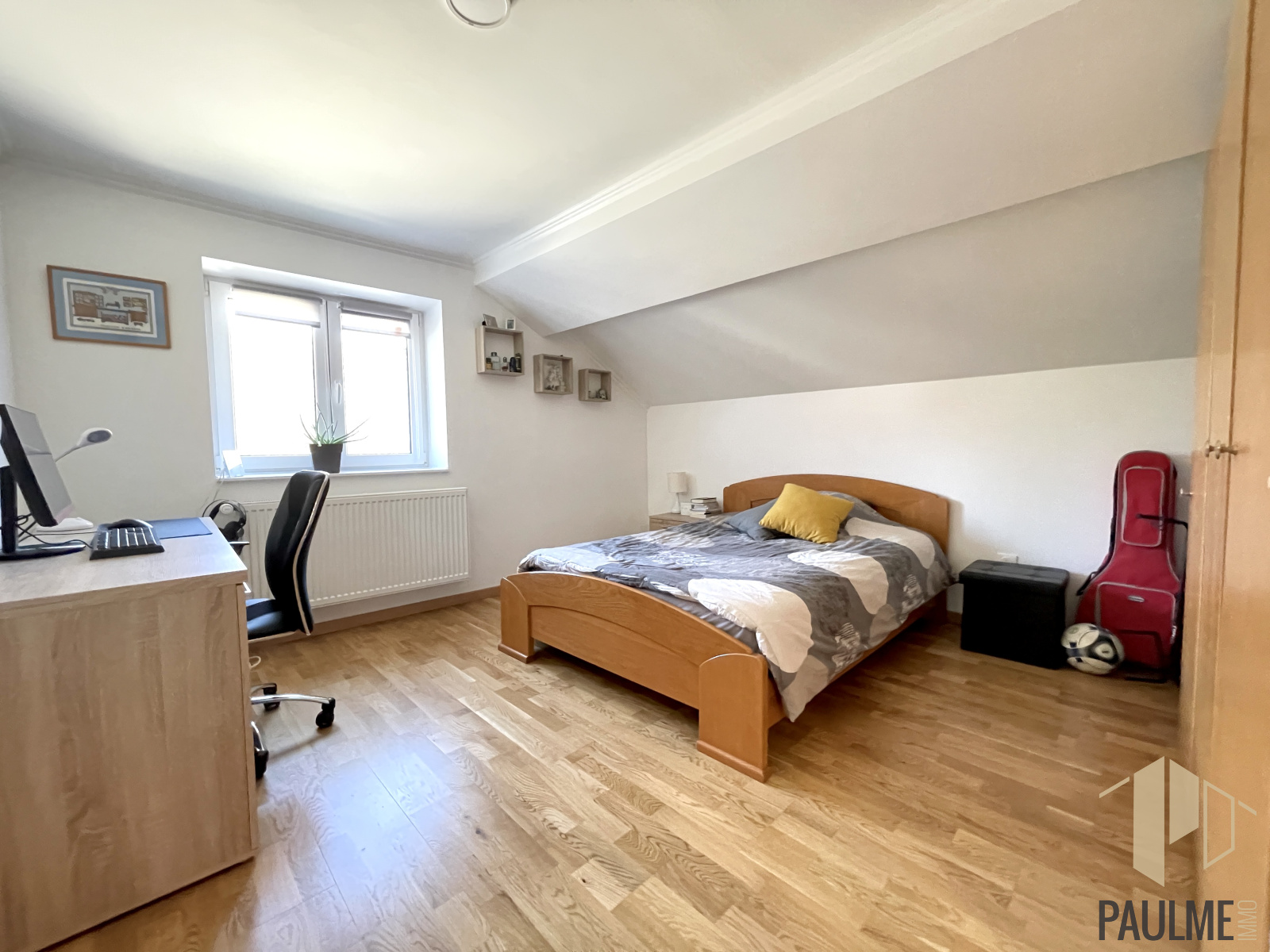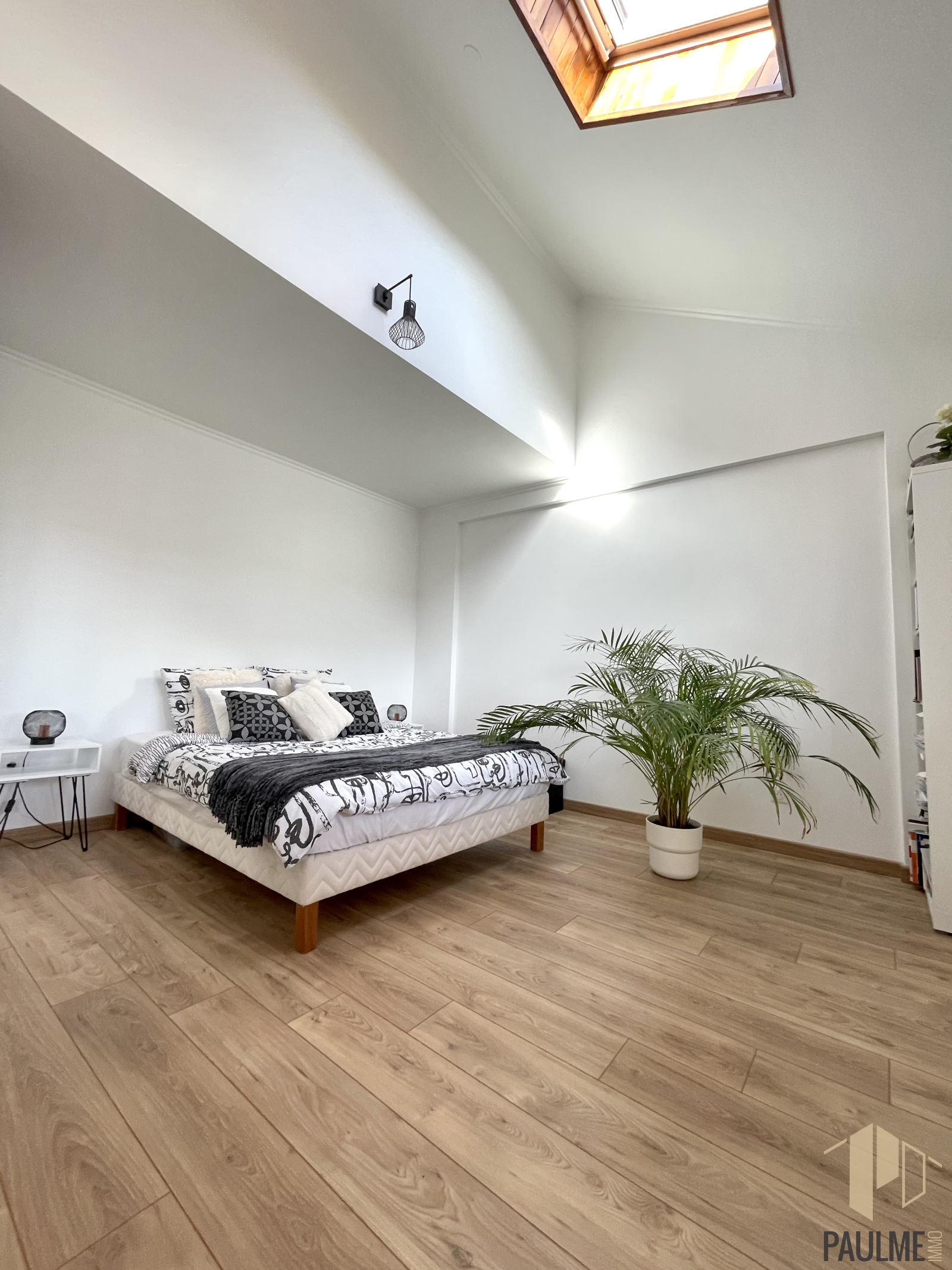 A l'étage : une mezzanine de 27 m2, une salle de bains avec WC et espace de rangement, deux chambres de 14 m2 au sol.