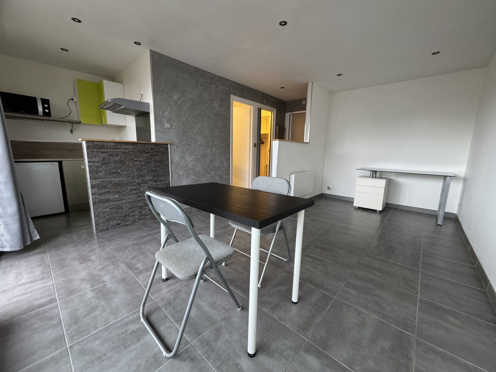 Cuisine équipée (plaque de cuisson électrique, hotte, micro-ondes, réfrigérateur)