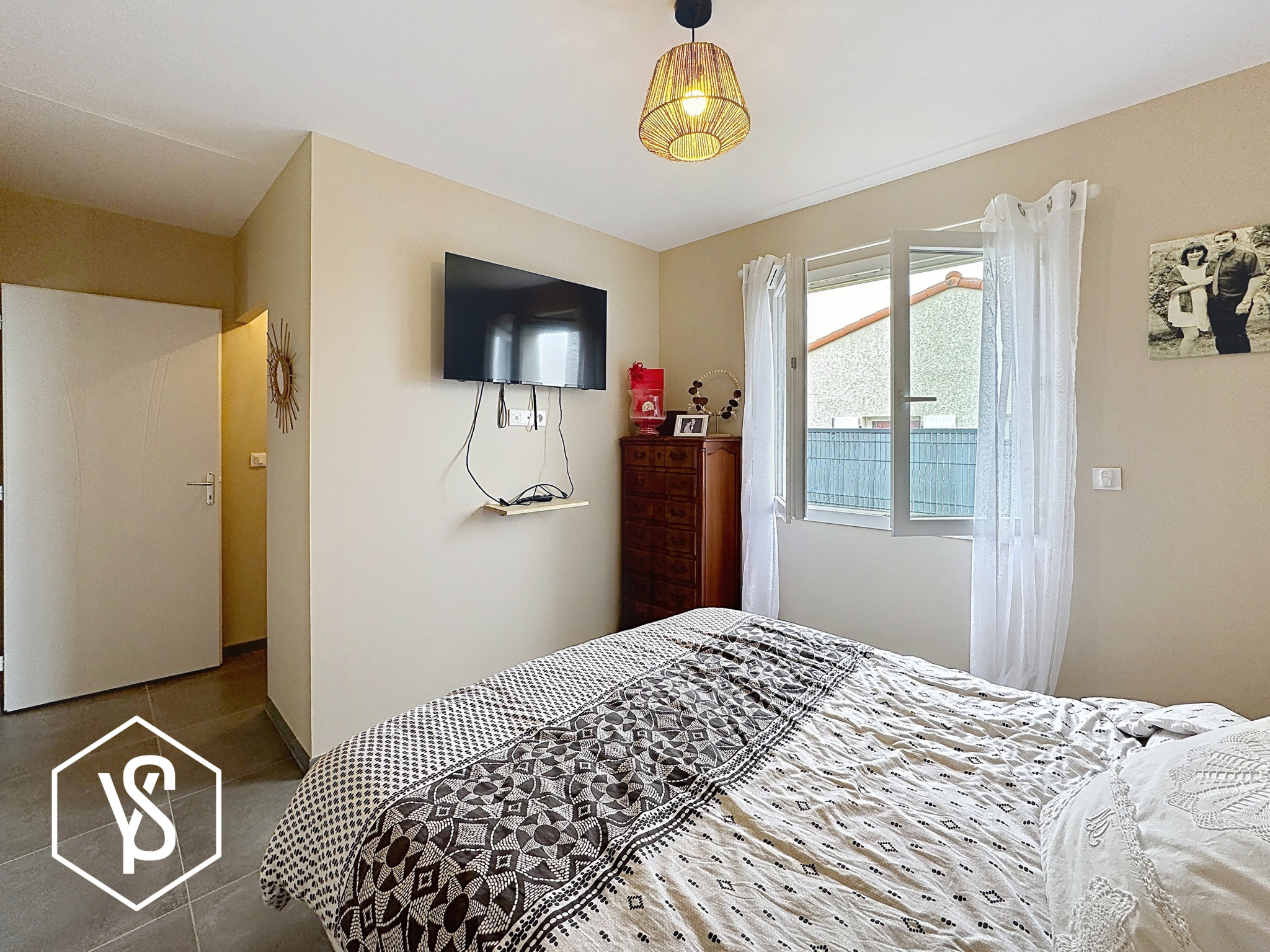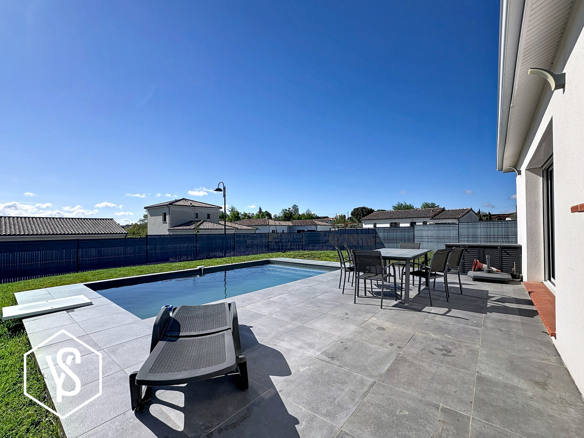 À l’extérieur, le jardin s’organise autour d’une piscine filtrée au sel de (6 x 3,5m), créant un véritable espace de détente autour de la terrasse de 32m².