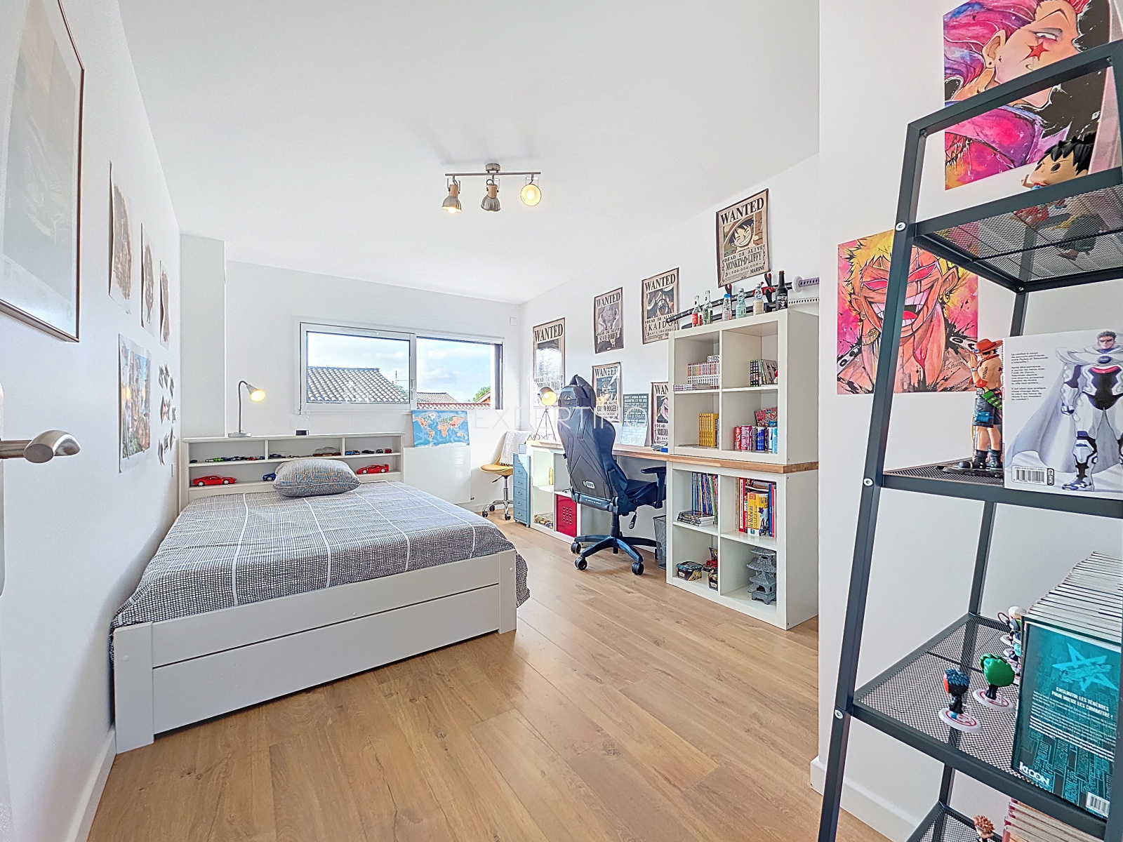 1er étage : salle de jeux (ou autre), deux chambres de 13,84 m² avec placards, salle d'eau, WC, grenier de rangement.