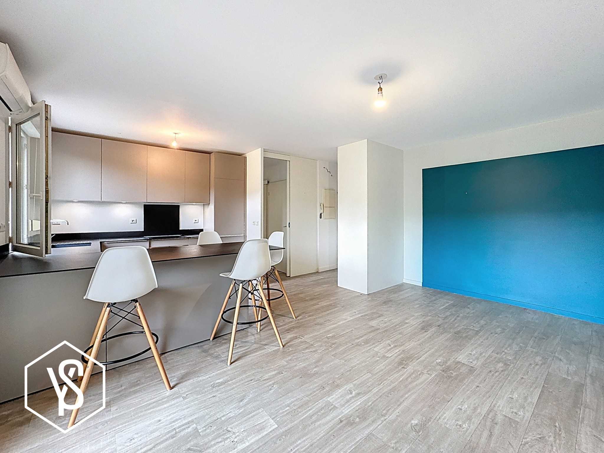 Hall d'entrée avec placard, pièce de vie de 25m² avec cuisine ouverte de belle facture, dégagement, WC séparé, salle d'eau et 2 chambres de 12m² et 8m².