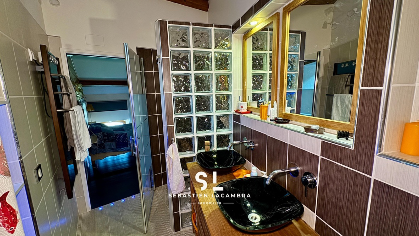 Douche, double vasque, sèche serviette électrique, WC sanibroyeur, VMC