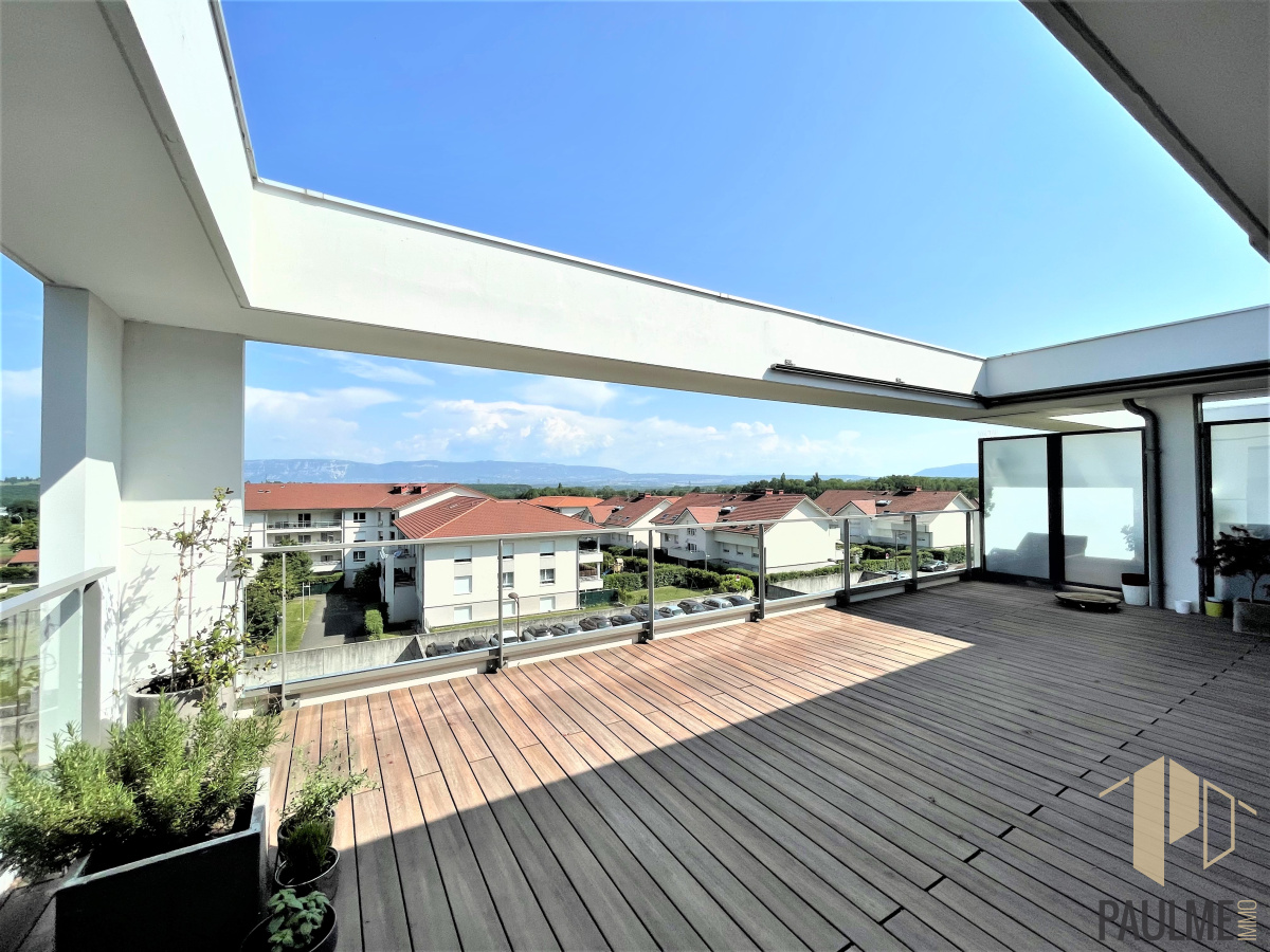 Ce bien traversant d'environ 88 m2 habitables comprend : une entrée avec placard, une cuisine entièrement équipée avec plan de travail en granit, ouverte sur le séjour donnant accès à la terrasse de 52 m2 côté Sud-Est avec vue Mont Blanc, 2 chambres avec terrasse de 17m2 dont une suite parentale avec salle d'eau/WC, une salle de bains, un WC séparé, une 3ème chambre.