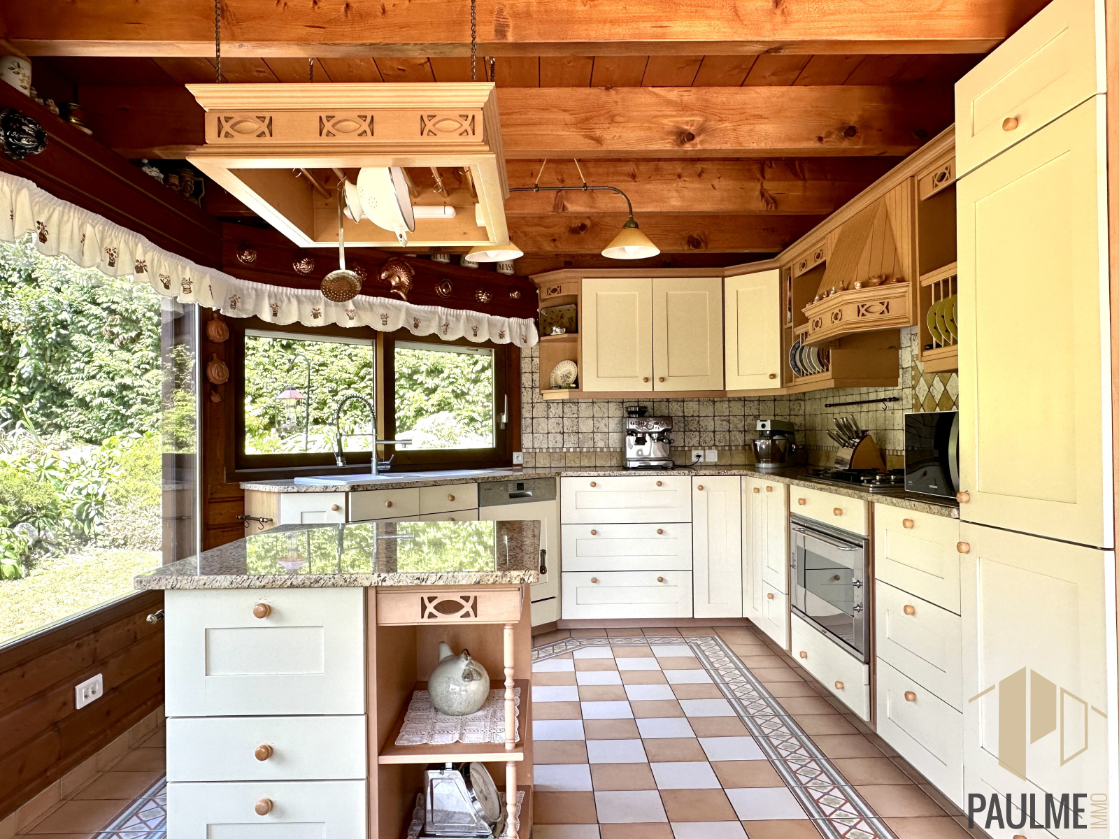 Très belles prestations entre autres : plan de travail en granit, crédence en travertin, sol en pierre naturelle, parquet et placards en chêne massif... Parfaitement entretenue.
