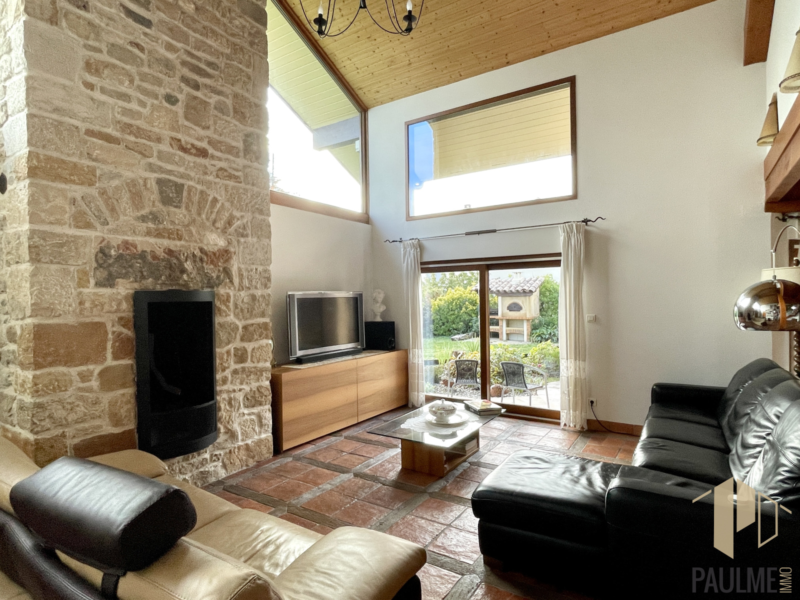 Garage double et grande cave carrelés. Vous pourrez profiter de la terrasse parfaitement exposée, du barbecue et du four à pizzas.
