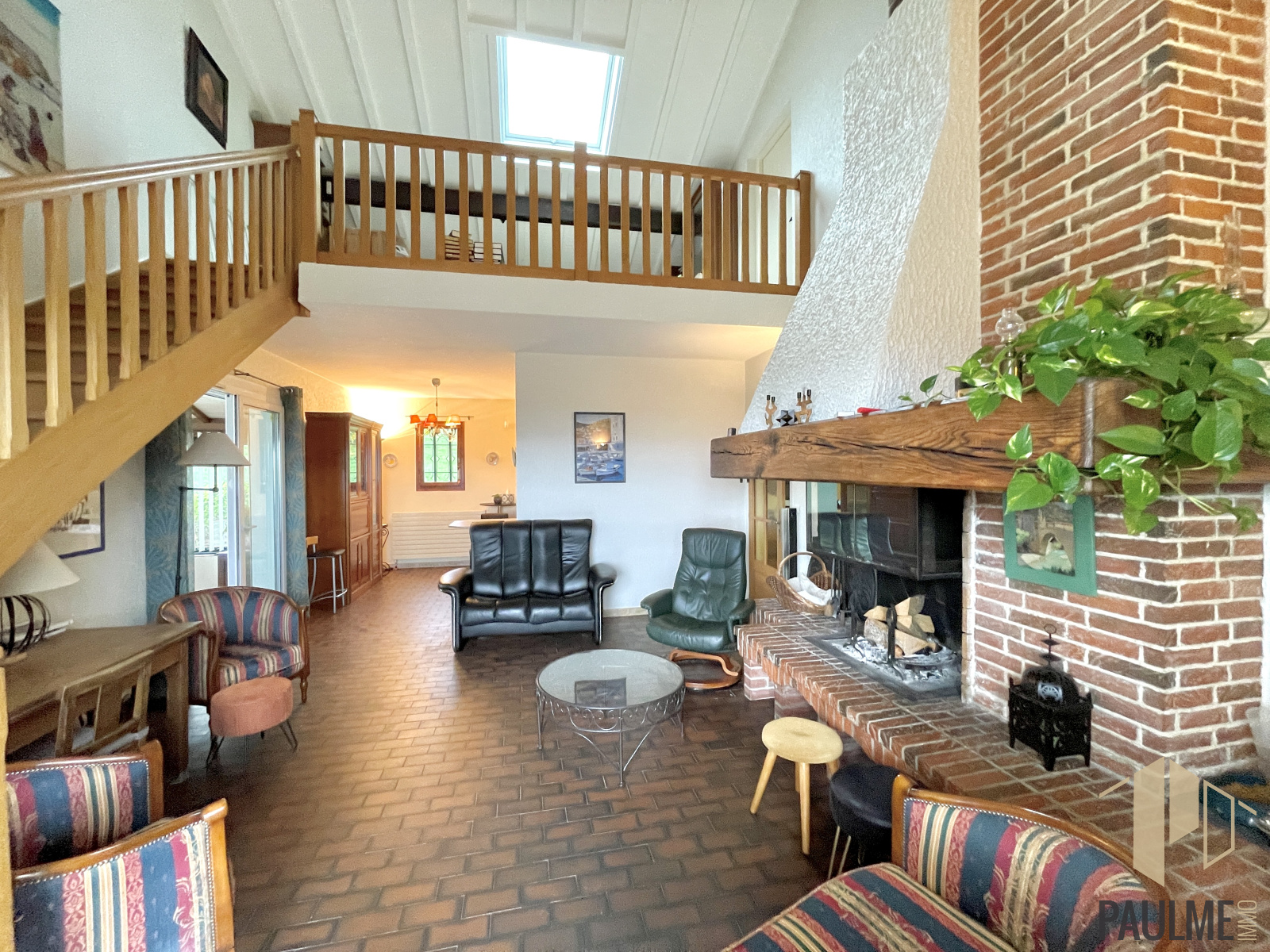- au 1er étage : 4 chambres, une salle de bains, un WC séparé, une cuisine fonctionnelle aménagée en chêne massif prolongée par un cellier, semi-ouverte sur l'espace salon avec cheminée et véranda de 18 m2 avec accès au jardin,