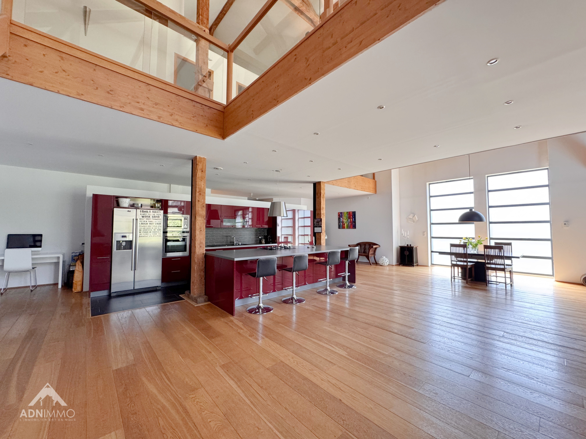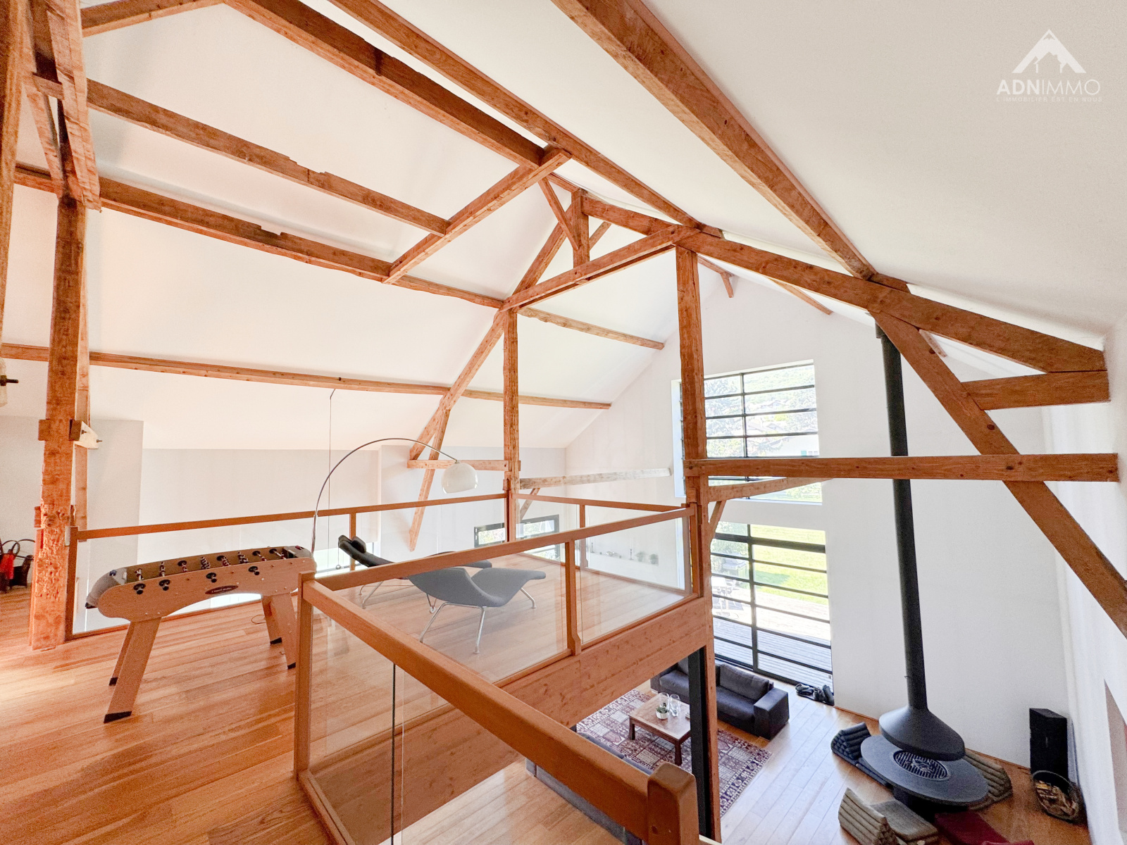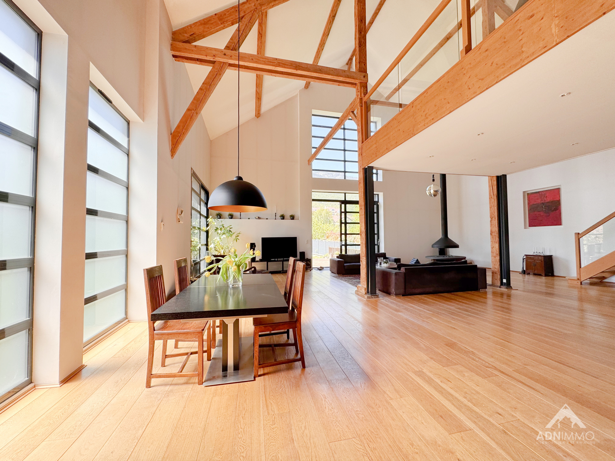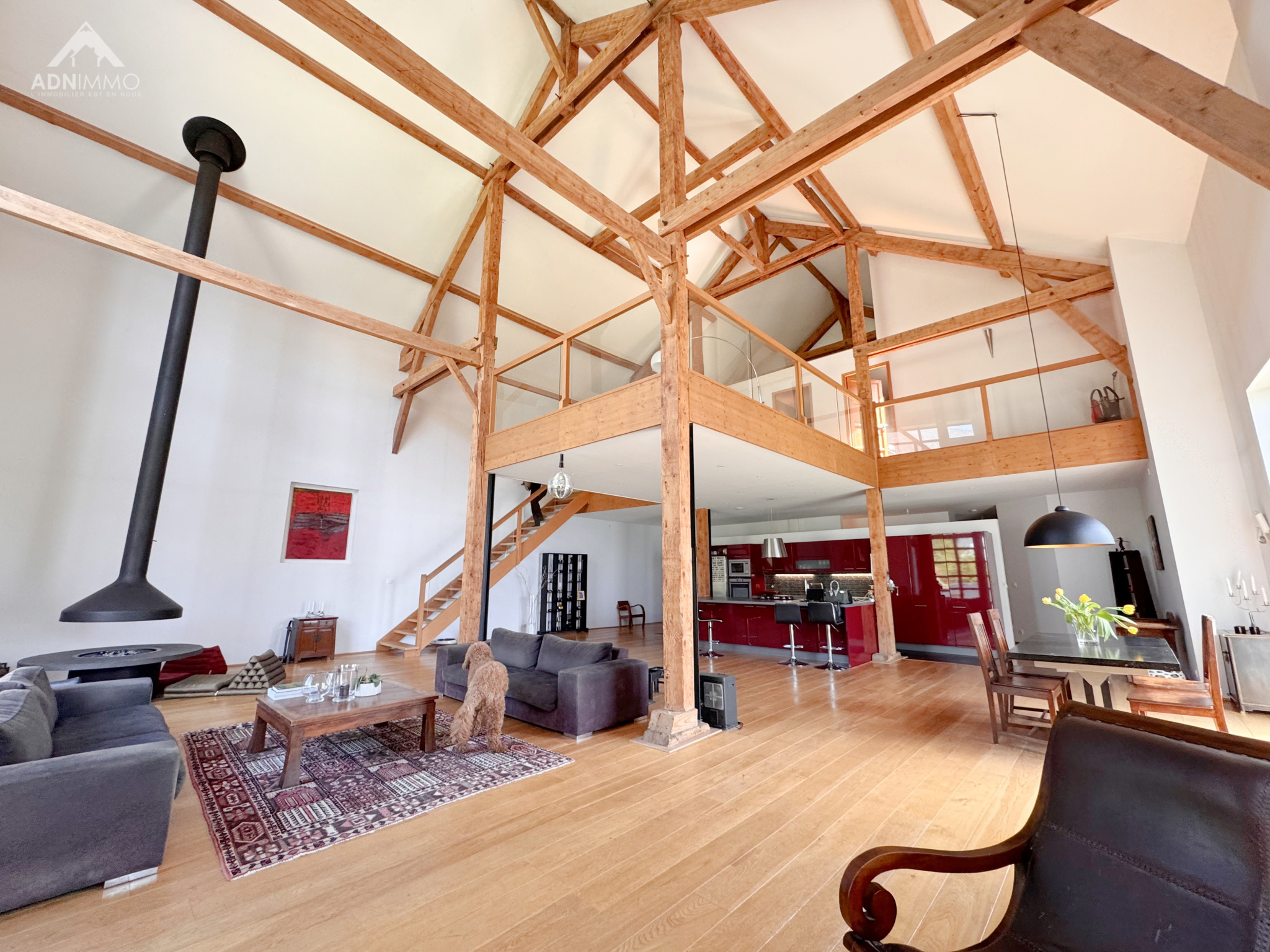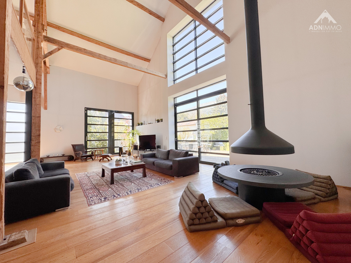 Dès l’entrée, le charme opère grâce à des volumes spectaculaires et une atmosphère chaleureuse. La pièce de vie, véritable cœur de la maison, impressionne par ses 130 m² baignés de lumière et sa hauteur sous plafond exceptionnelle de 9,50 mètres, offrant une sensation d’espace incomparable.