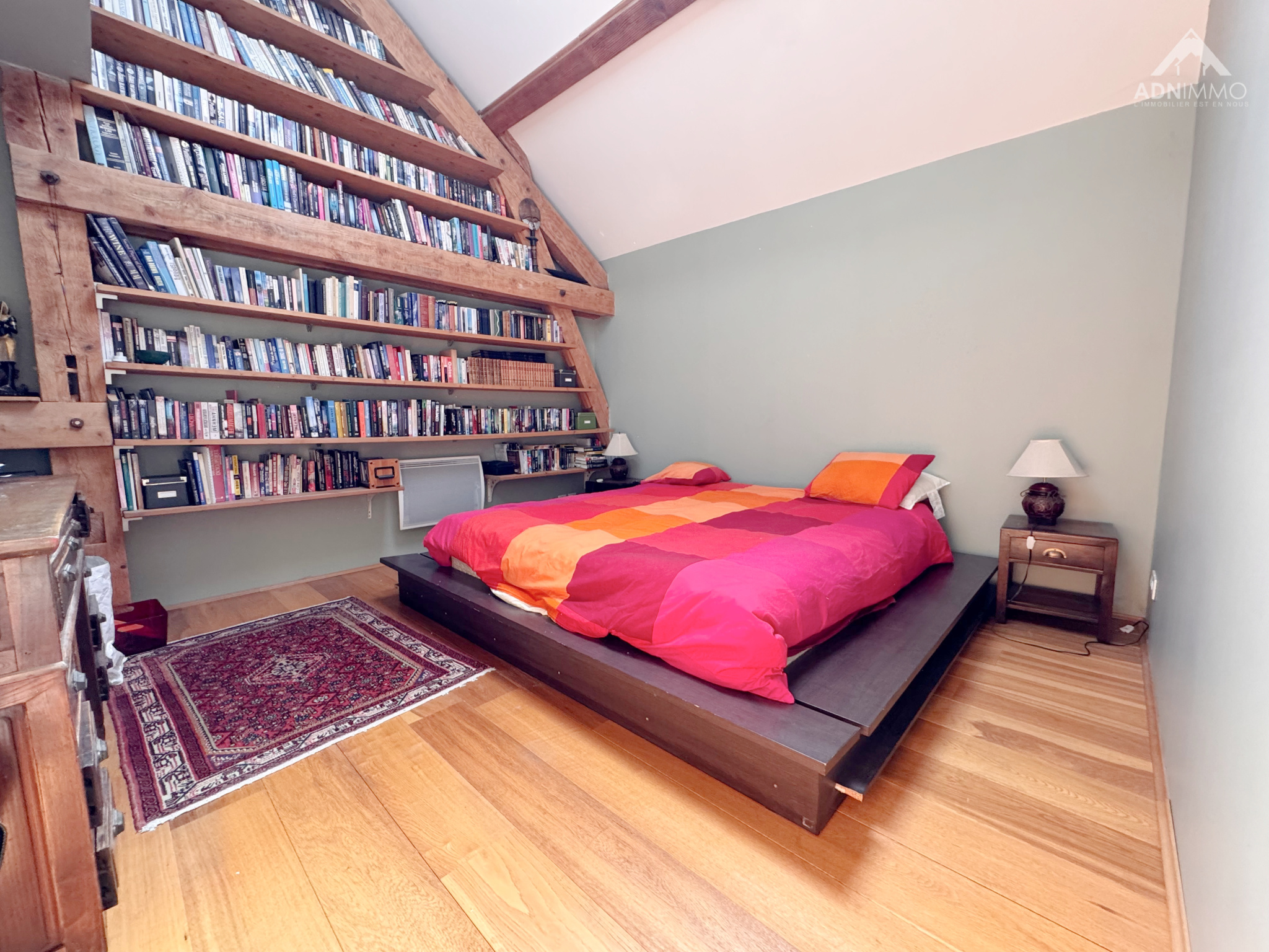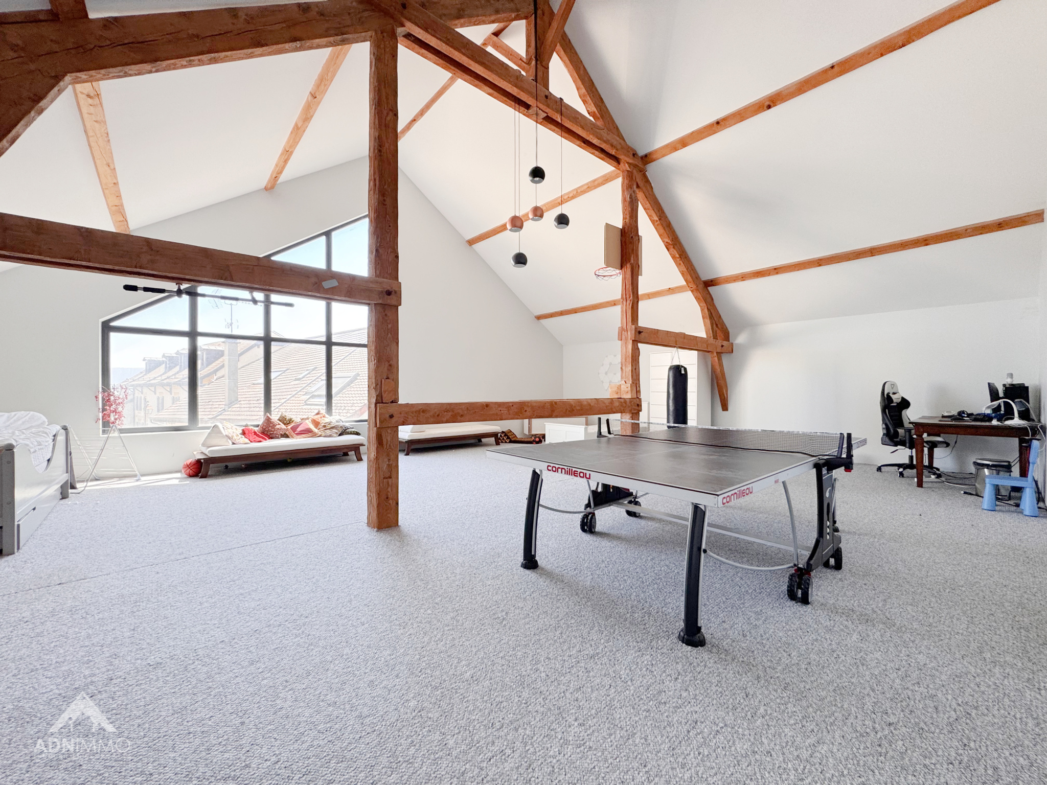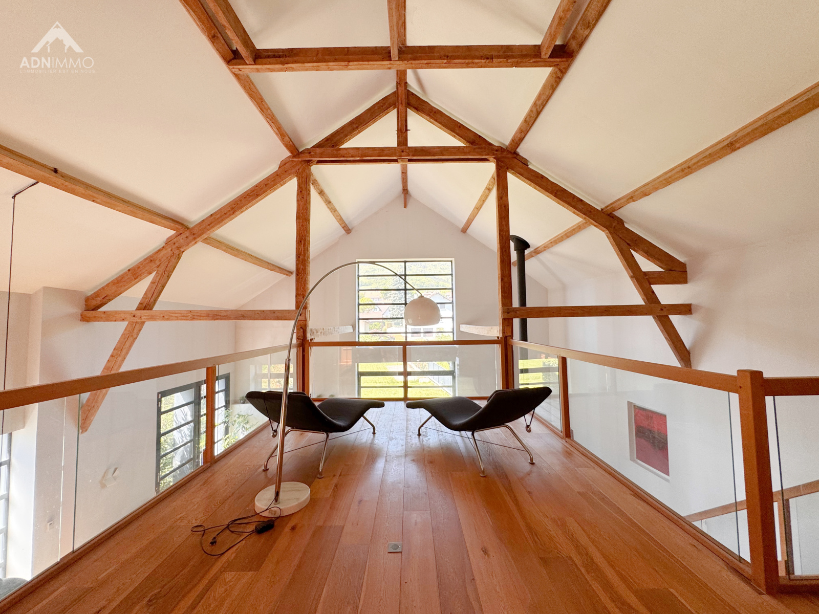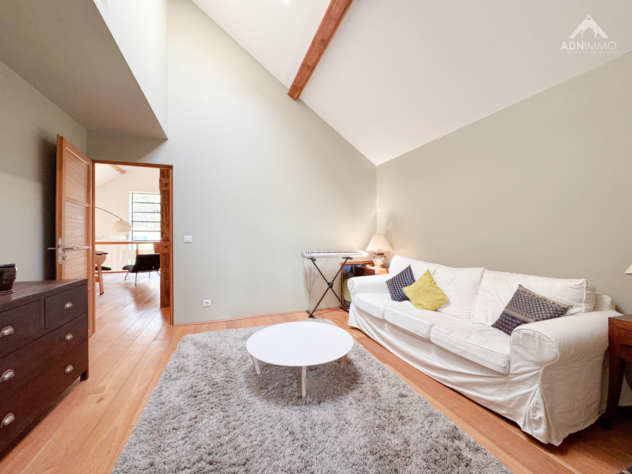 Dès l’entrée, le charme opère grâce à des volumes spectaculaires et une atmosphère chaleureuse. La pièce de vie, véritable cœur de la maison, impressionne par ses 130 m² baignés de lumière et sa hauteur sous plafond exceptionnelle de 9,50 mètres, offrant une sensation d’espace incomparable.