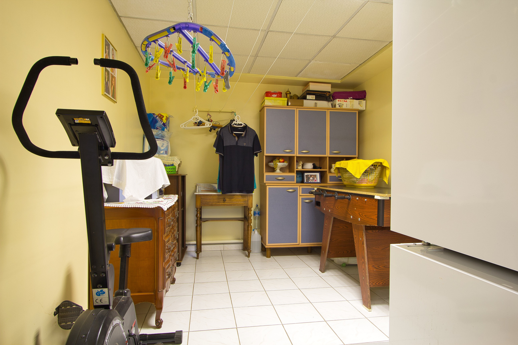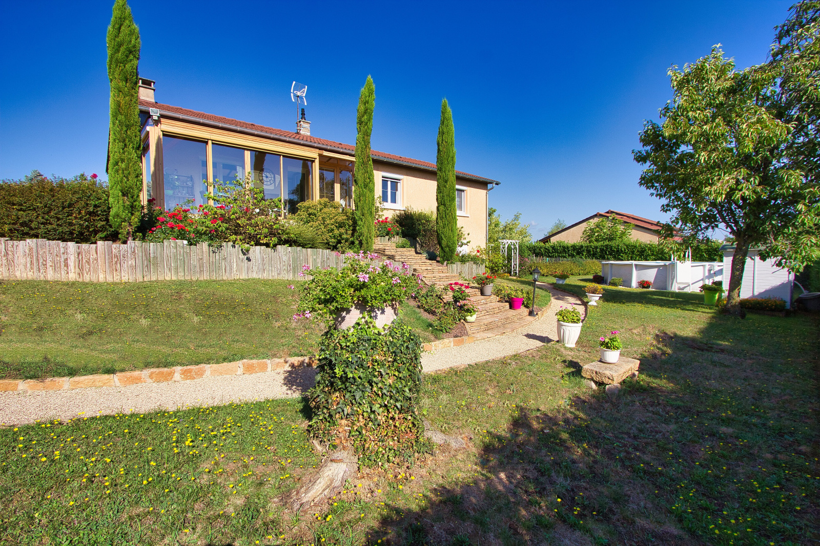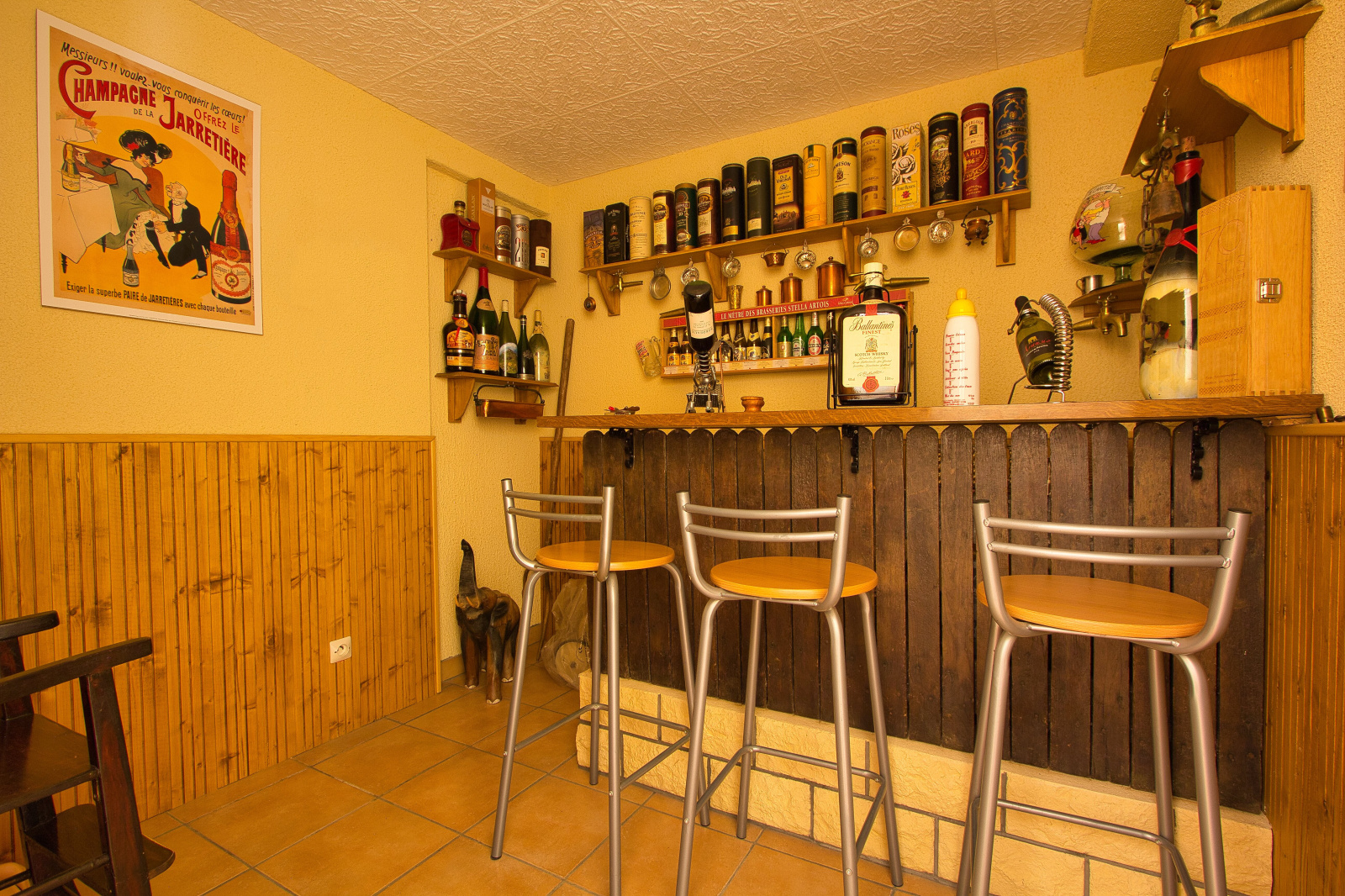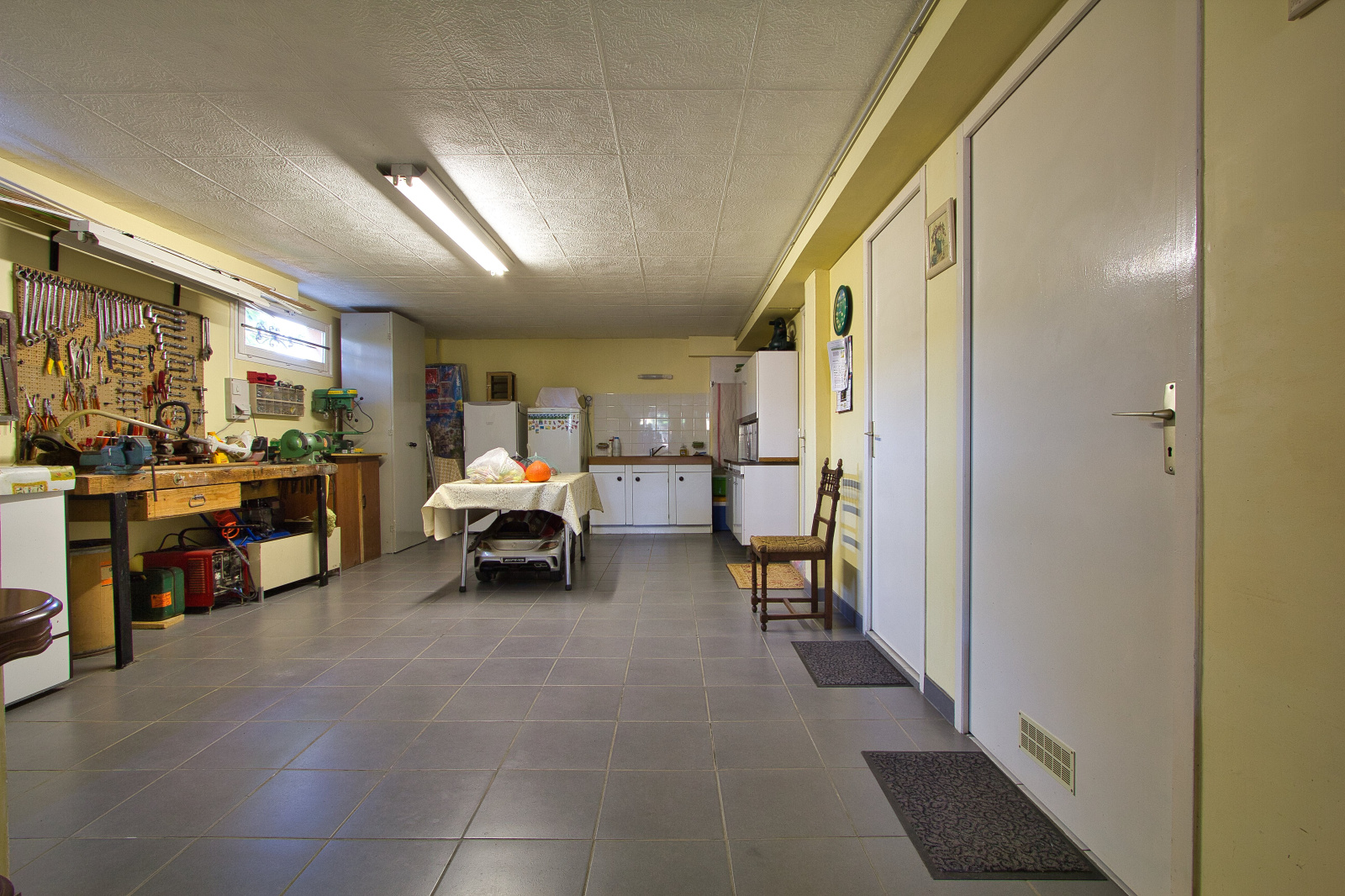 - au niveau inférieur : un garage, un atelier, un caveau (le tout carrelé), une 4ème chambre, une buanderie avec douche et WC, une chaufferie.