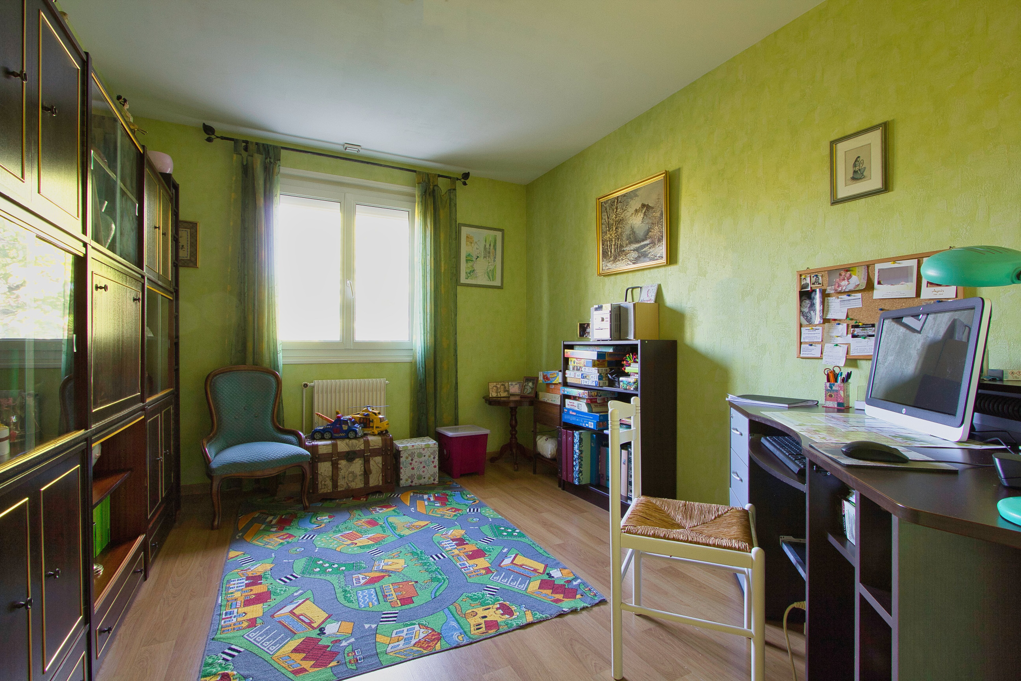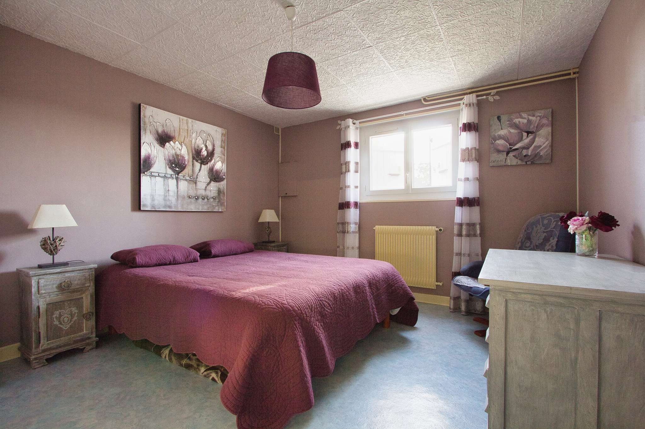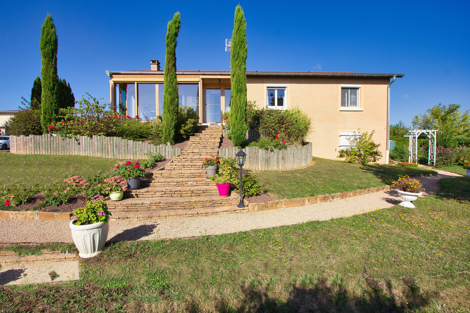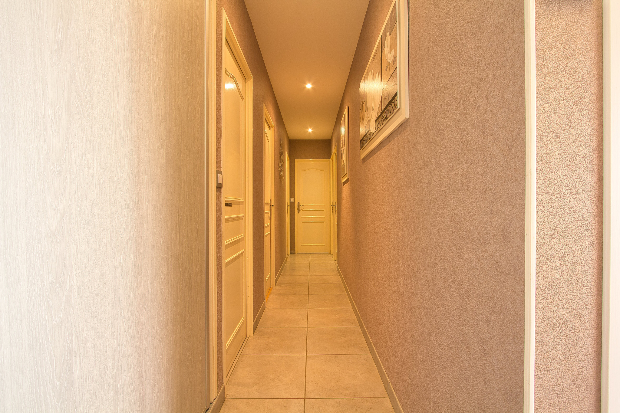 - au niveau inférieur : un garage, un atelier, un caveau (le tout carrelé), une 4ème chambre, une buanderie avec douche et WC, une chaufferie.