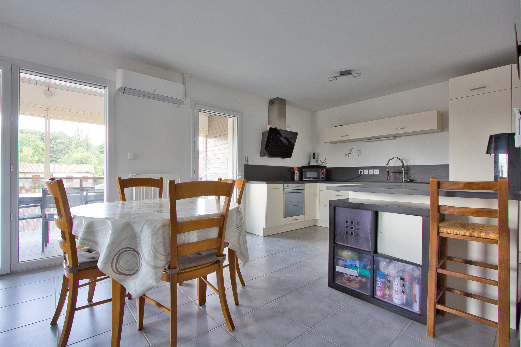 D'une entrée avec rangements, une cuisine toute équipée (avec pièce buanderie/cellier) ouverte sur salon/salle à manger et donnant accés à une superbe terrasse, trois chambres avec placards muraux, une salle de bain et un WC séparé.
