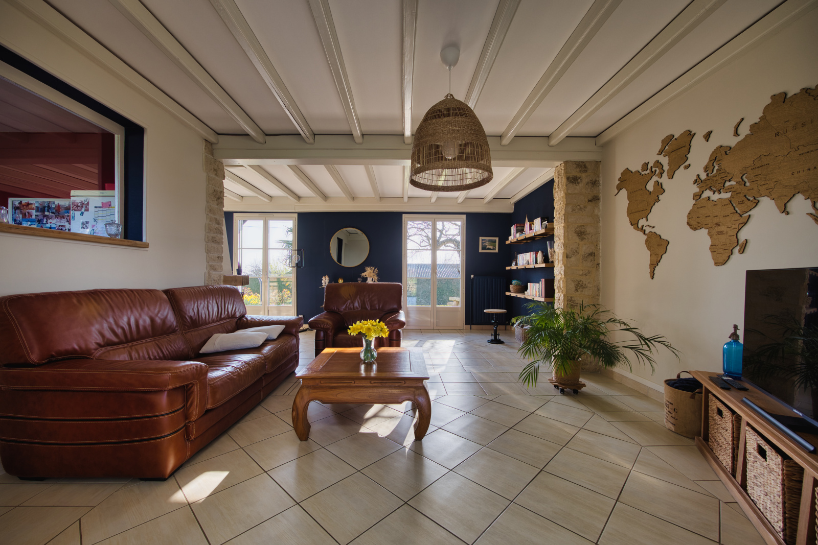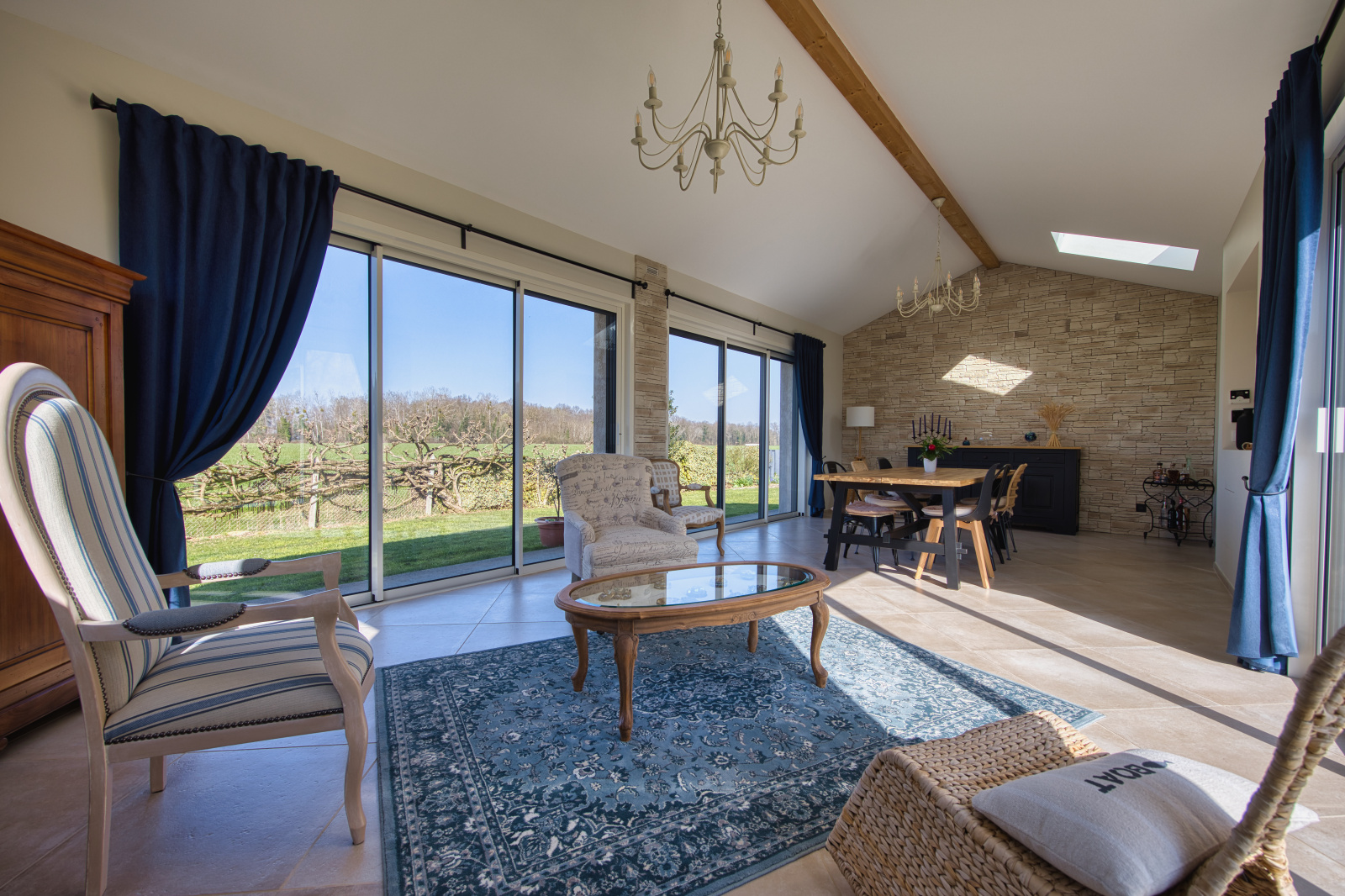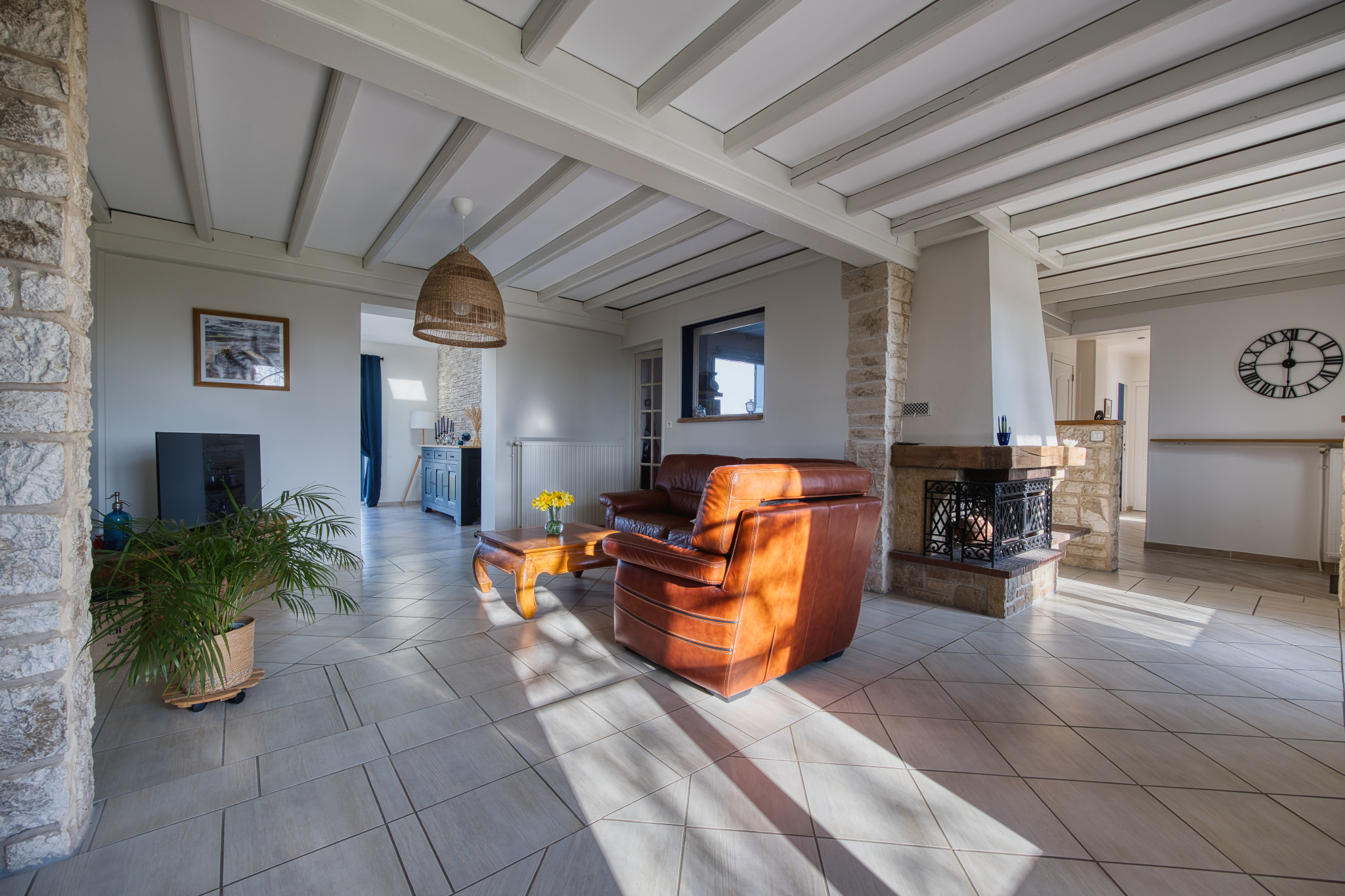 D'un hall d'entrée desservant une belle cuisine toute équipée, un premier salon avec cheminée donnant accés direct à la terrasse, un deuxième spacieux et superbe salon/salle à manger donnant également accés direct à l'extérieur et offrant une vue imprenable sur la campagne environnante, trois belles chambres parquetées, une salle de douche et un WC séparé.