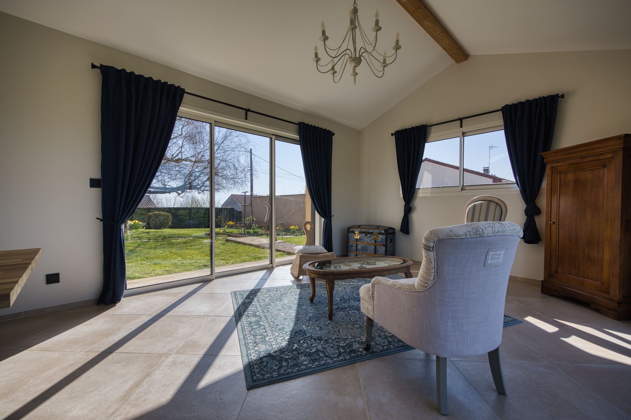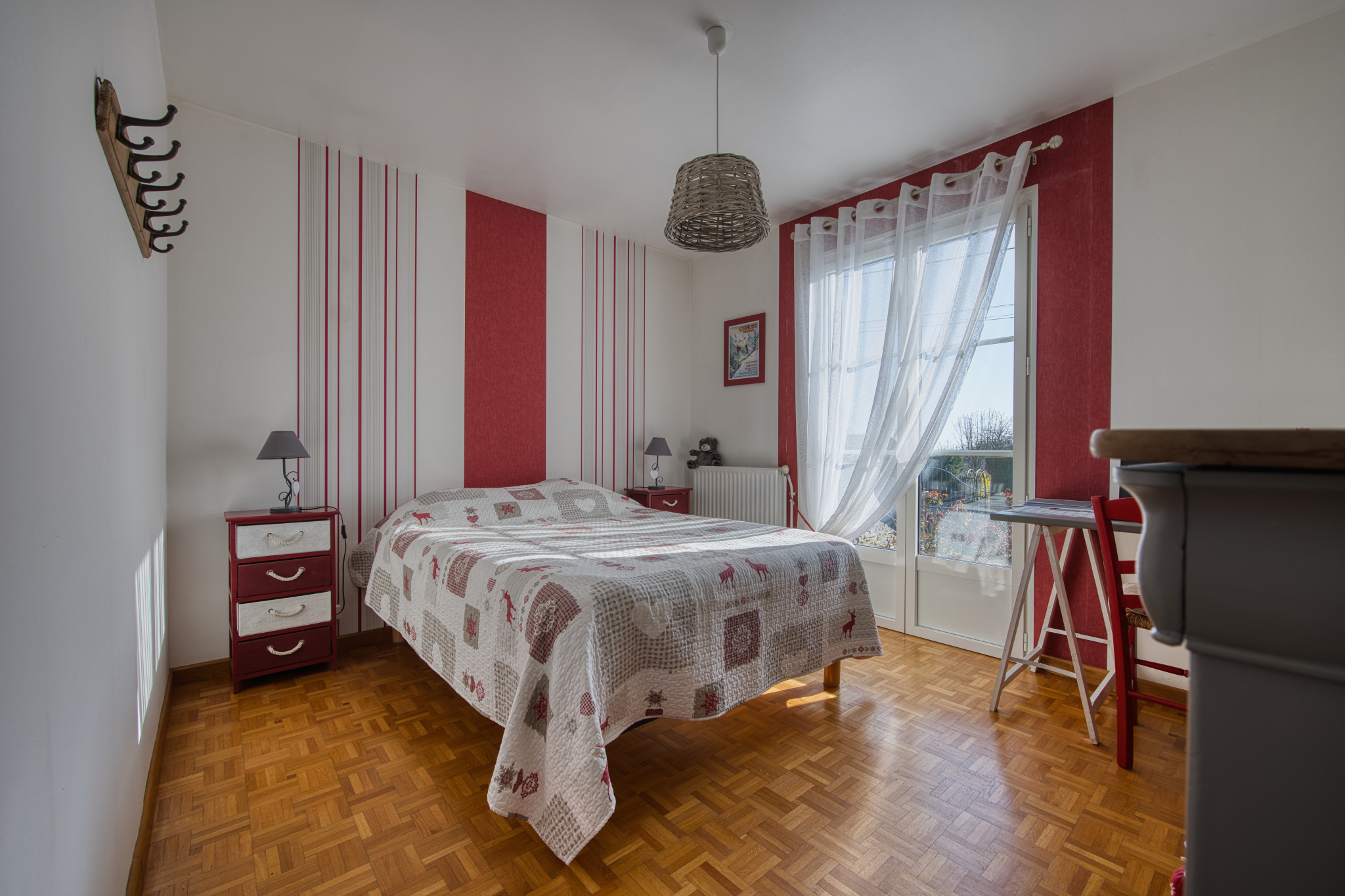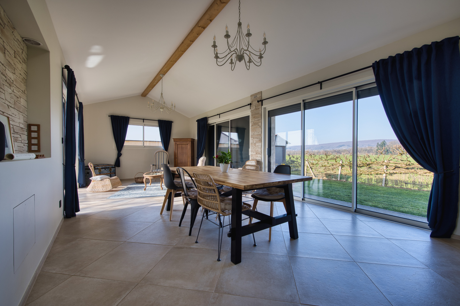 D'un hall d'entrée desservant une belle cuisine toute équipée, un premier salon avec cheminée donnant accés direct à la terrasse, un deuxième spacieux et superbe salon/salle à manger donnant également accés direct à l'extérieur et offrant une vue imprenable sur la campagne environnante, trois belles chambres parquetées, une salle de douche et un WC séparé.
