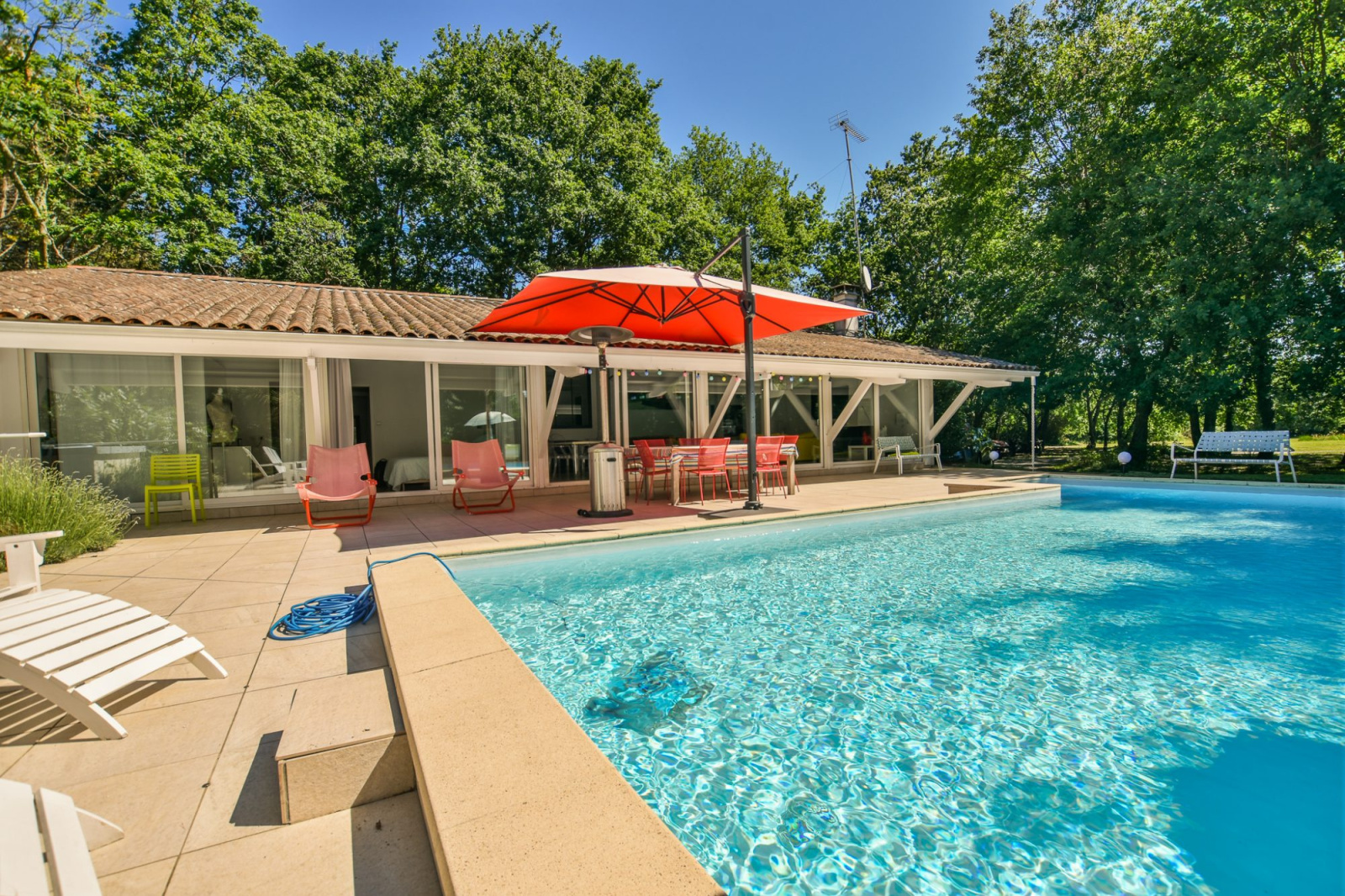 La Teste de Buch, magnifique villa style Girolle de plain-pied avec 3 chambres, 1 bureau, mezzanine, édifiée sur un parc arboré de 4 724 m2 avec piscine (8x4) au sel, garage et carport. Le tout situé sans vis à vis, proche des commerces, des plages, des établissements scolaires et de toutes les activités. Belle exposition ensoleillée, double vitrage, chauffage par le sol au gaz, portail automatique, carport et volets roulants électriques. Entrée, séjour-salon avec cheminée, cuisine indépendante équipée et aménagée, arrière cuisine, 3 chambres dont 1 suite parentale avec dressing, douche et wc, bureau, mezzanine, salle d'eau desservant les 2 autres chambres, wc et garage. D'autres photos, un plan, ainsi qu'un descriptif détaillé et complet du bien sont à votre entière disposition sur simple demande. Groupe DIÉ IMMOBILIER - Guillaume DIÉ - Agent Immobilier - 06 86 28 96 72 - commercial@die-immobilier.net