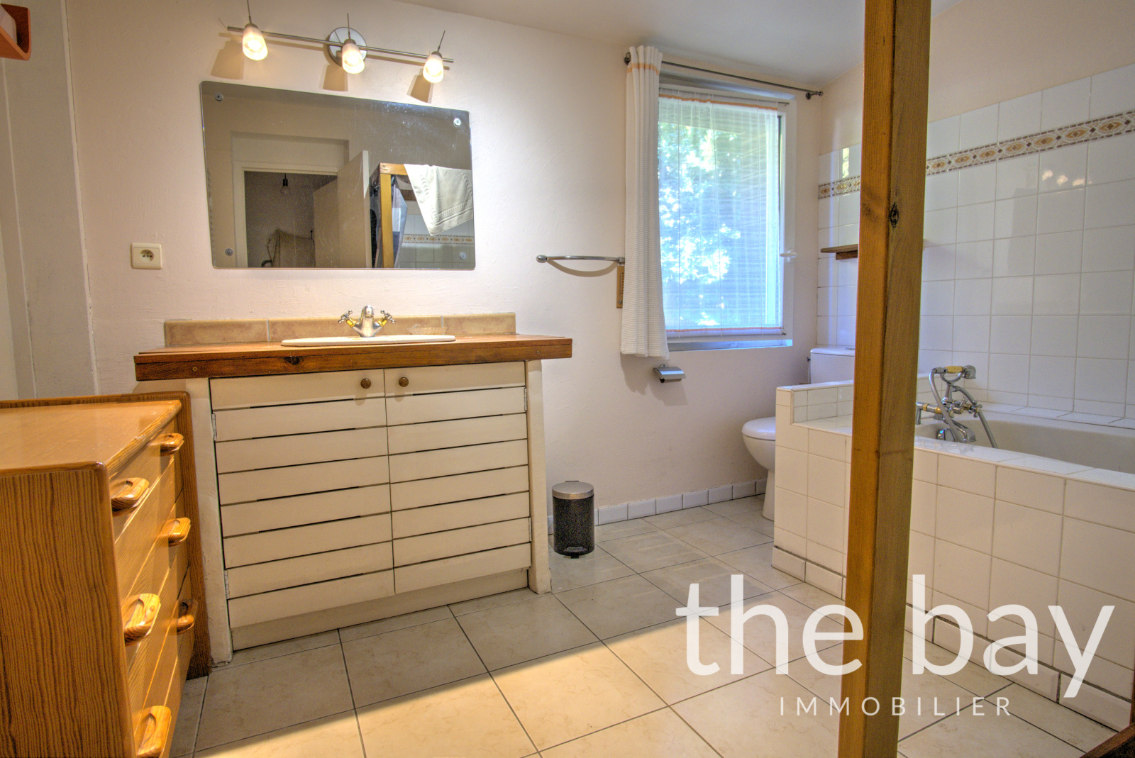 Elle se compose d’un vaste salon-séjour très lumineux (orientation sud) avec cuisine ouverte, donnant directement sur la terrasse et la piscine. La partie nuit offre trois grandes chambres ainsi qu’une salle de bain complète avec douche, baignoire et WC, à laquelle s’ajoute un WC indépendant.