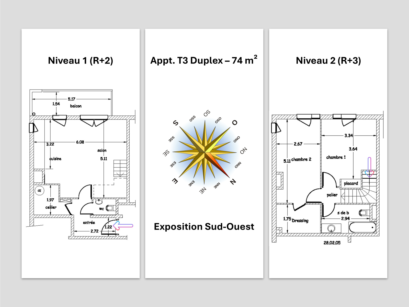 - Niveau 2 (duplex) : dégagement, salle de bains avec WC, 2 belles chambres avec espace dressing.