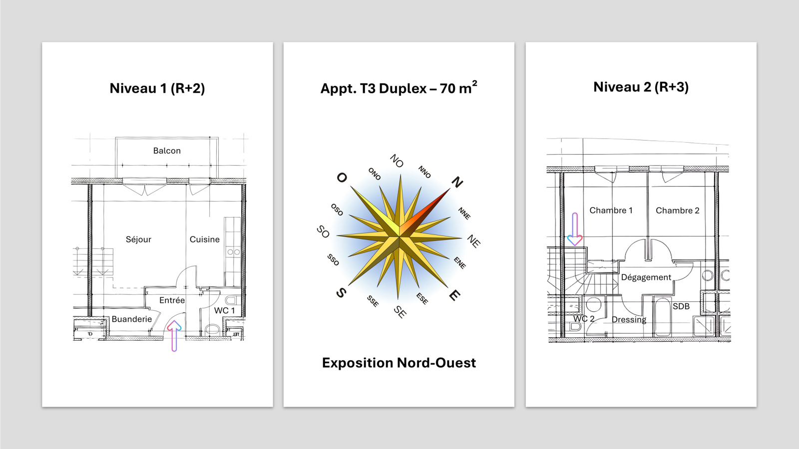 - Niveau 2 (duplex) : dégagement, 2 belles chambres, salle de bains (baignoire + douche), espace dressing et WC indépendant.